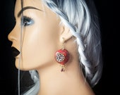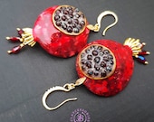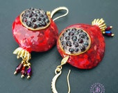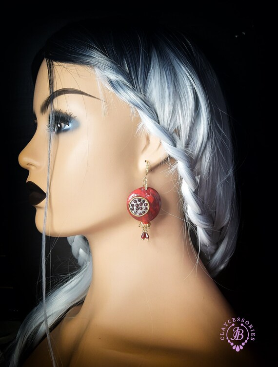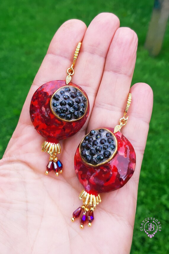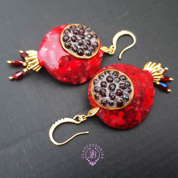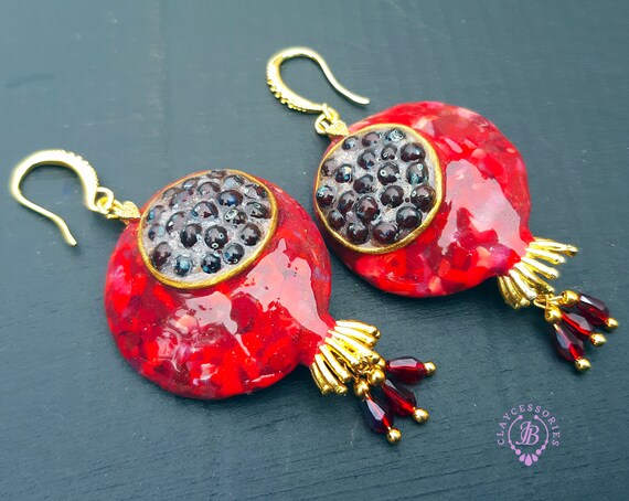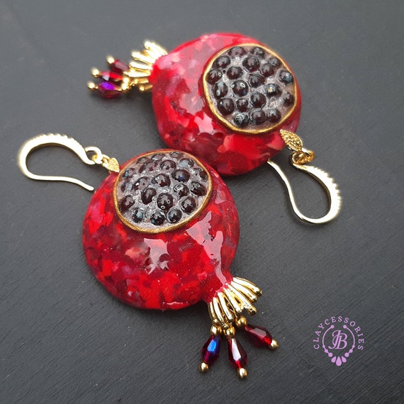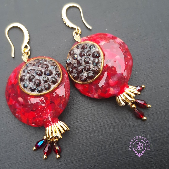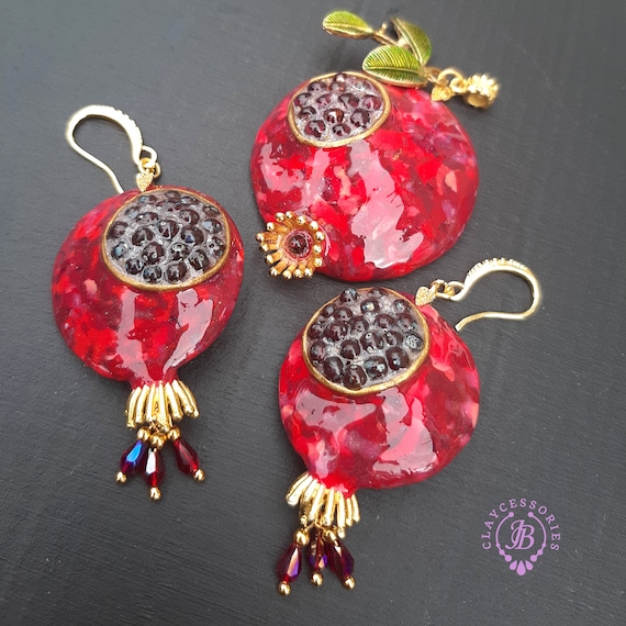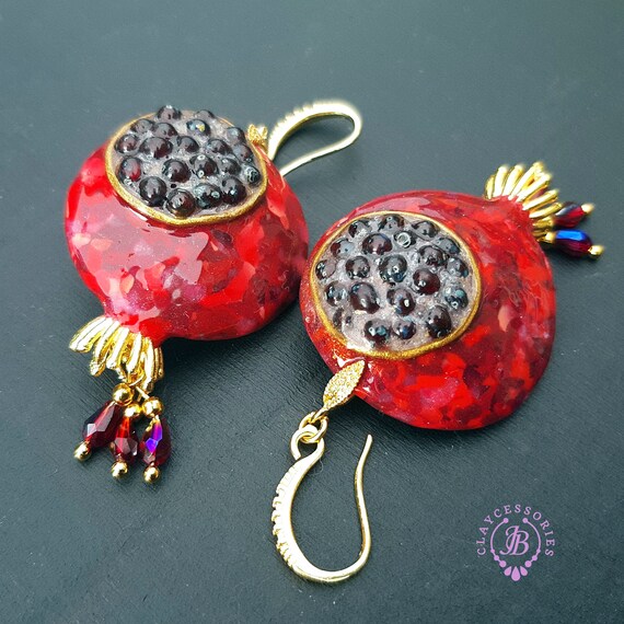 Garnet Pomegranate dangle earrings, bright, very light and shimmer in the sun. All details are sculpted and cut out of high-quality coloured polymer clay on a metal frame, the colours do not fade or fade in the sun, decorated by Garnet beads. Single copy,100% Handmade OOAK earrings matching ring: pomegranate garnet adjustable ring fruit. matching pendant: