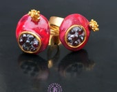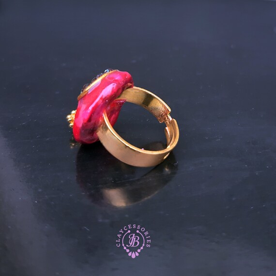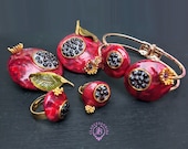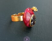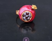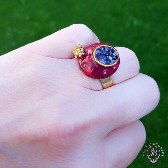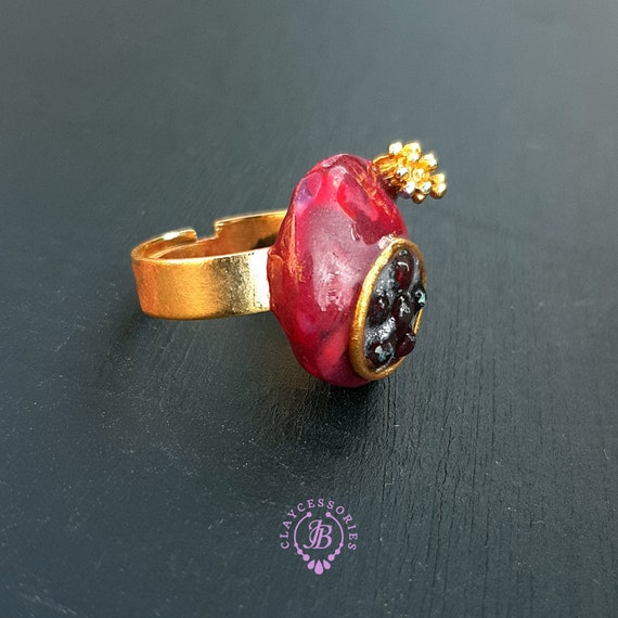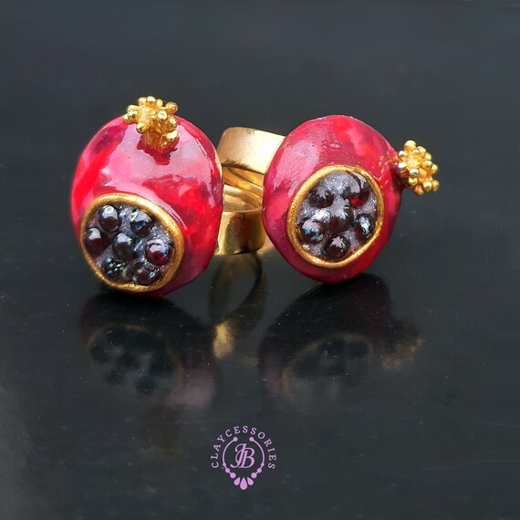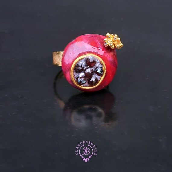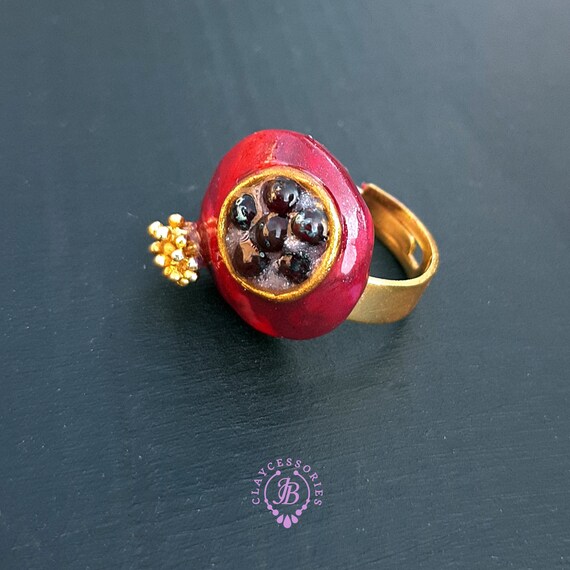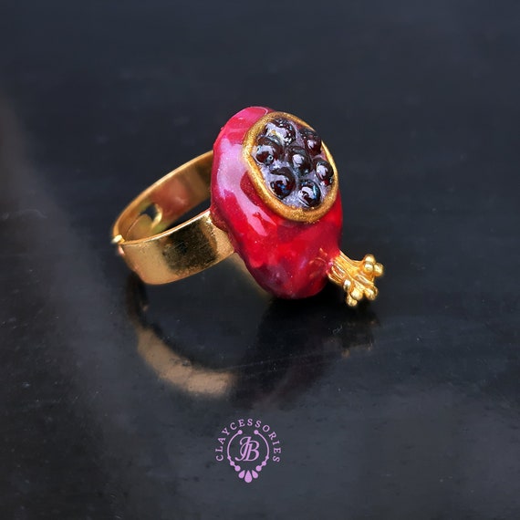 Pomegranate Garnet adjustable ring, bright, very light and shimmer in the sun, is the best gift for the Rosh Hashanah celebration. All details are sculpted and cut out of high-quality coloured polymer clay on a metal frame, the colours do not fade or fade in the sun, decorated by Garnet beads. Single copy,100% Handmade OOAK ring. matching pendant: garnet pomegranate pendant pomegranate. matching bracelet:
