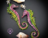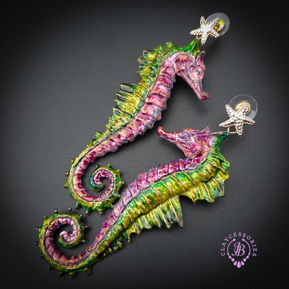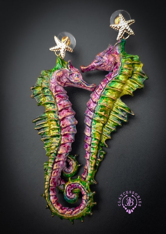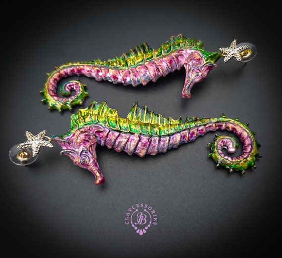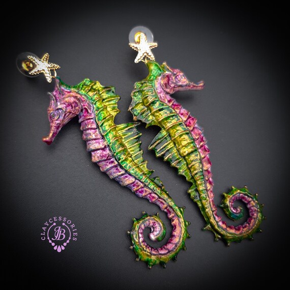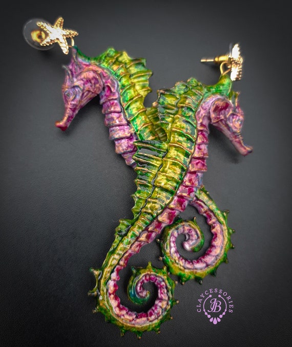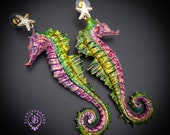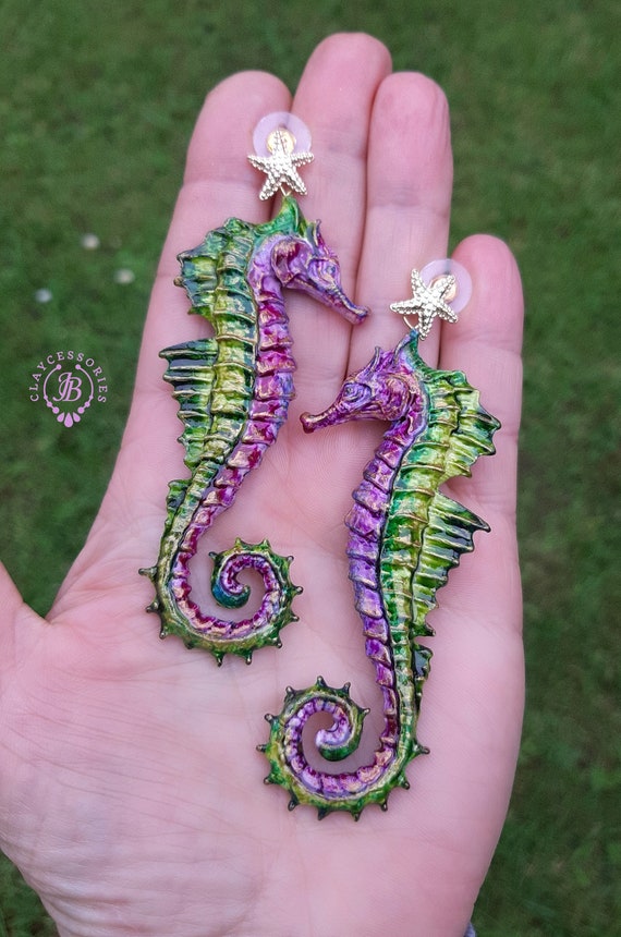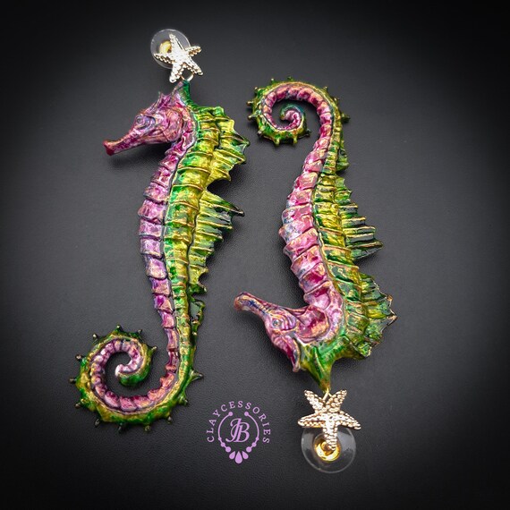 Seahorse Nautical Art earrings, bright, shiny, long but very lightweight, made by high-quality polymer clay and enamel paint. Single copy 100% Handmade OOAK earrings. All items are shipped from my home within 1-3 business days after payment confirmation. I make some custom orders. If you would like some items to be custom made or created for you in a special way, feel free to send an Etsy conversation with your requirements, and we can discuss them.