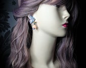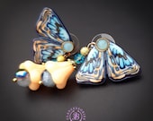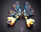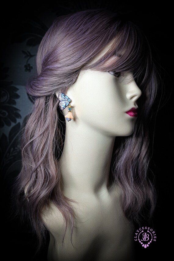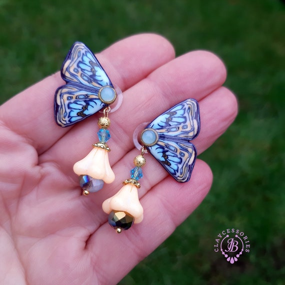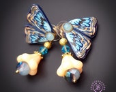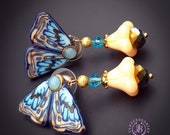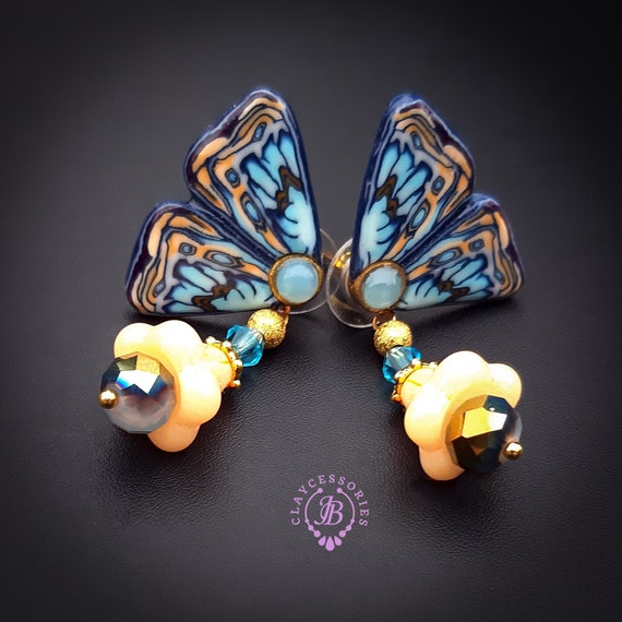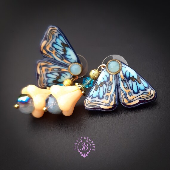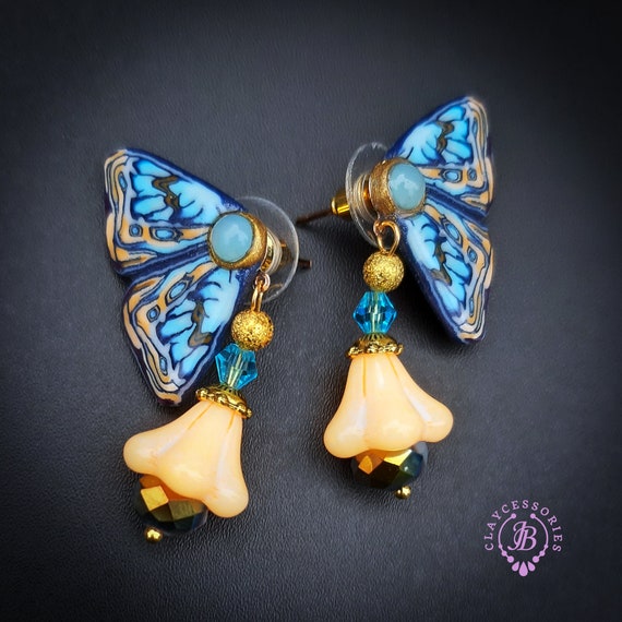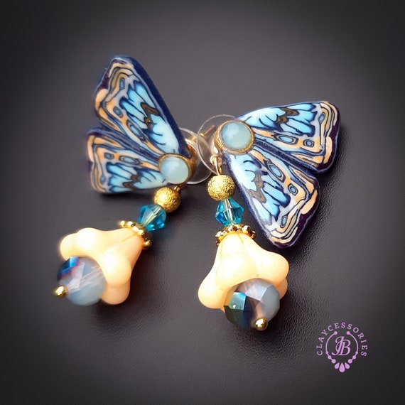 Blue butterfly earrings in Art Nouveau style, bright, very light and shimmer in the sun. All details are sculpted and cut out of high-quality coloured polymer clay, the colours do not fade or fade in the sun, decorated by natural Blue Calcedony cabochons. Single copy,100% Handmade OOAK earrings. matching necklace: butterfly venetian mask necklace. All items are shipped from my home within 1-3 business days after payment confirmation. Please, contact me with any questions. I make some custom orders. If you would like some items to be custom made or created for you in a special way, feel free to send an Etsy conversation with your requirements, and we can discuss them.