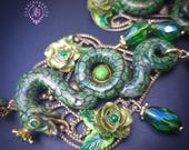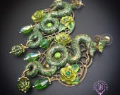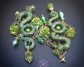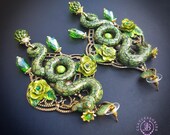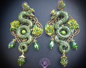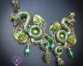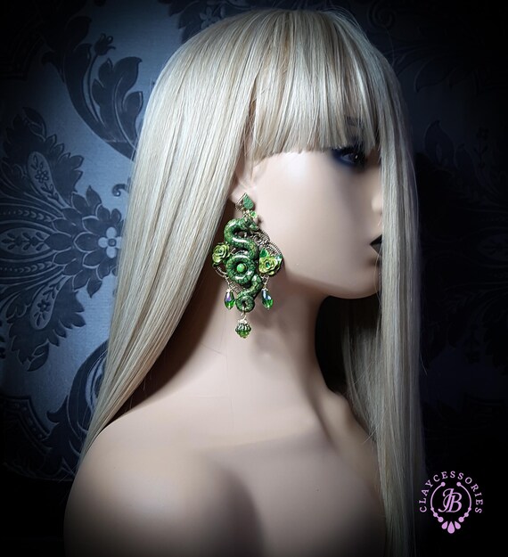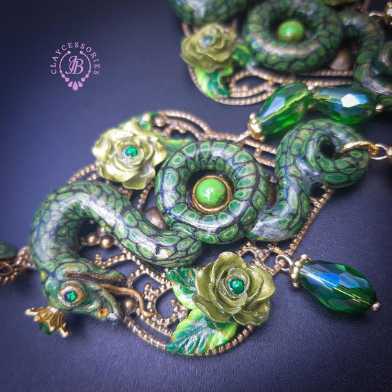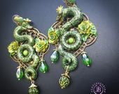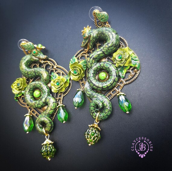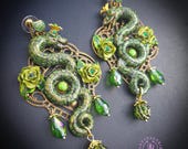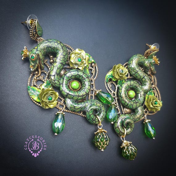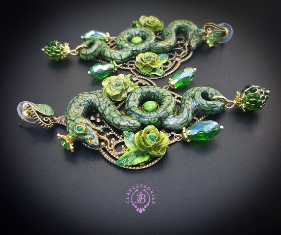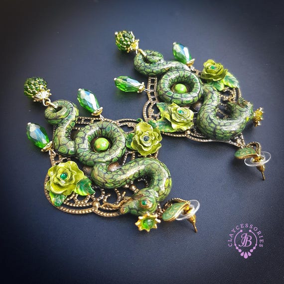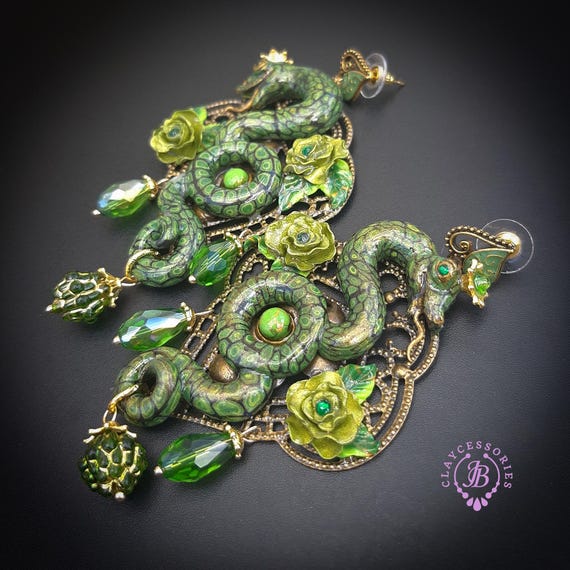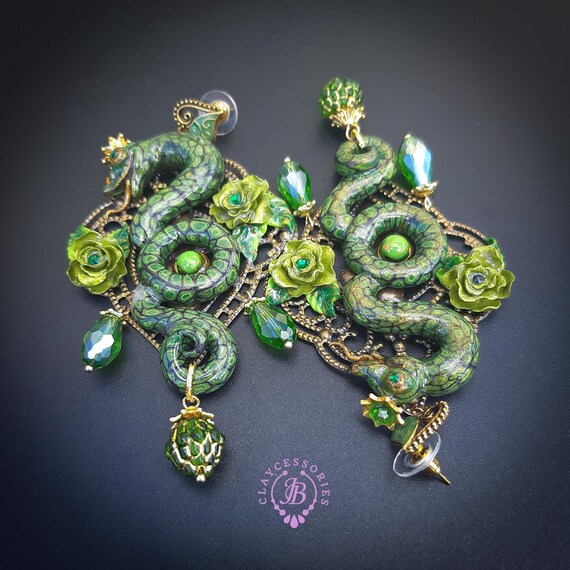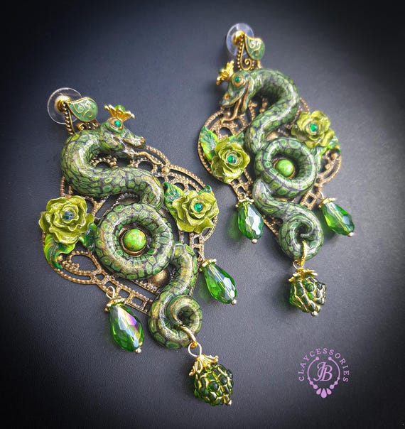 Green Snake statement earrings in Art Nouveau style, the snakeskin pattern and all details are hand-sculpted from high-quality polymer clay, colours do not wash out and do not fade in the sun. Single copy,100% Handmade OOAK earrings. All items are shipped from my home within 1-3 business days after payment confirmation. Please, contact me with any questions. I make some custom orders. If you would like some items to be custom made or created for you in a special way, feel free to send an Etsy conversation with your requirements, and we can discuss them.