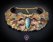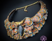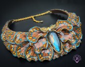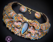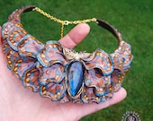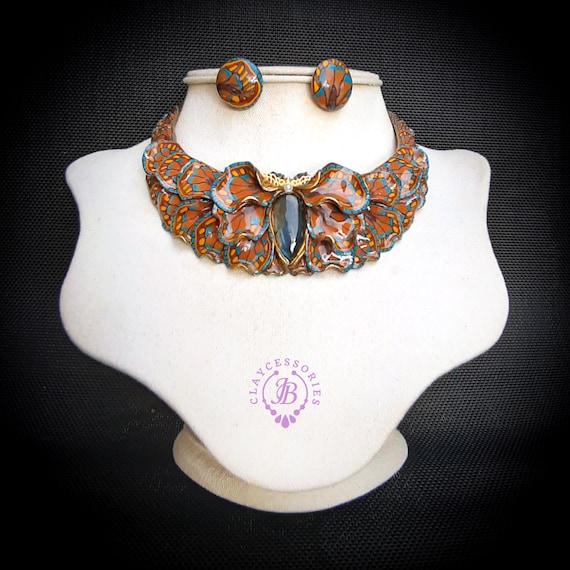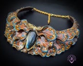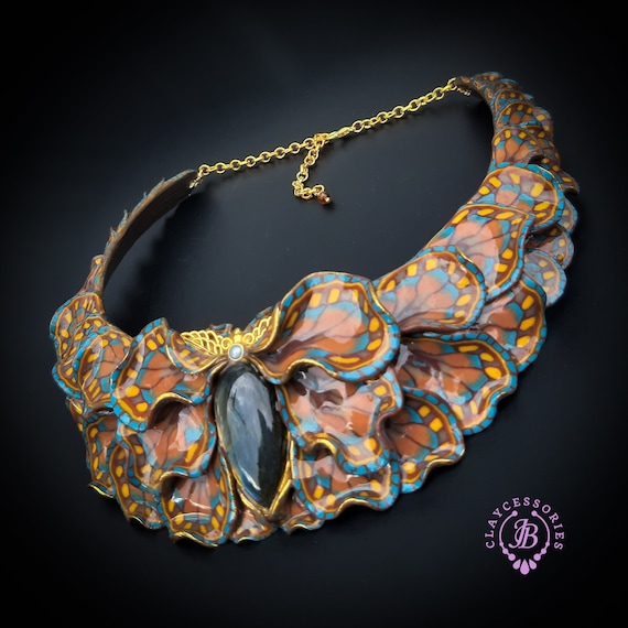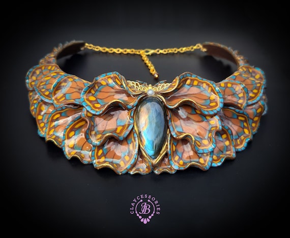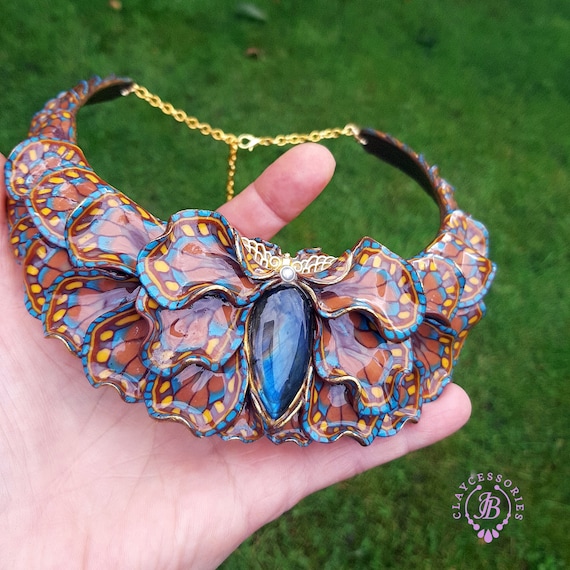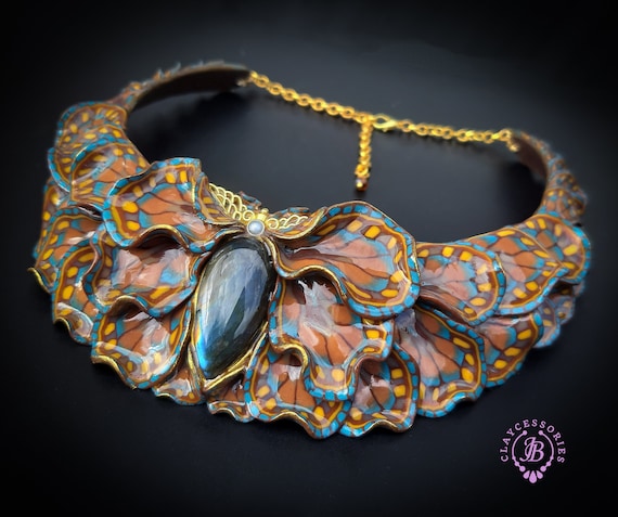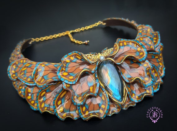 Butterfly wings bib necklace, made of high-quality colourful polymer clay, decorated by natural Lbaradorite cabochons, earrings included as optional accessories. Single copy,100% Handmade OOAK necklace. All items are shipped from my home within 1-3 business days after payment confirmation. I make some custom orders. If you would like some items to be custom made or created for you in a special way, feel free to send an Etsy conversation with your requirements, and we can discuss them.