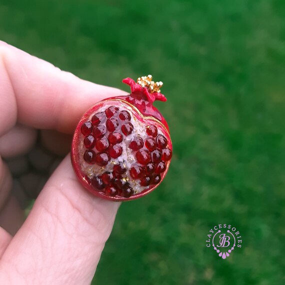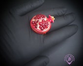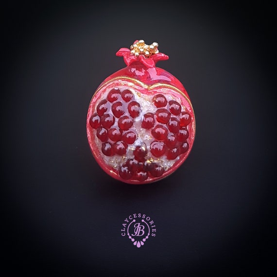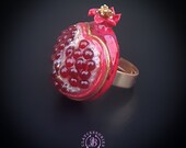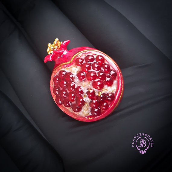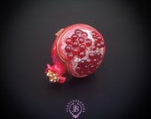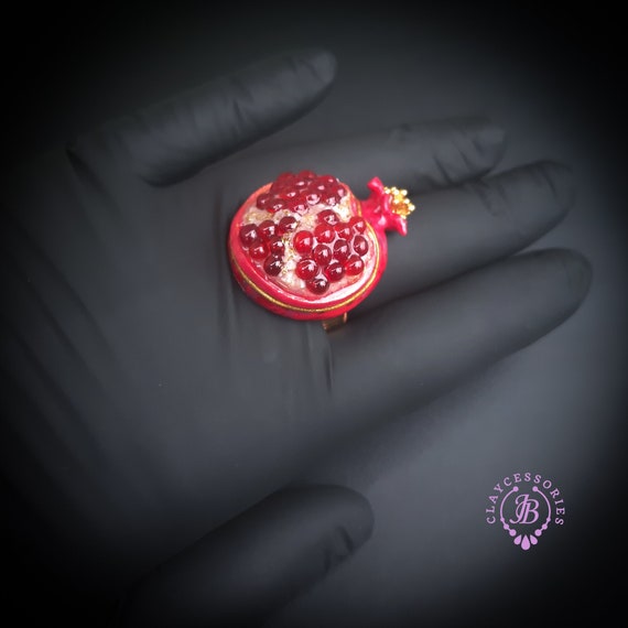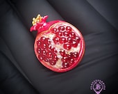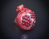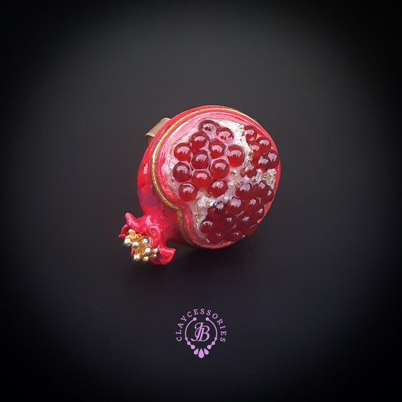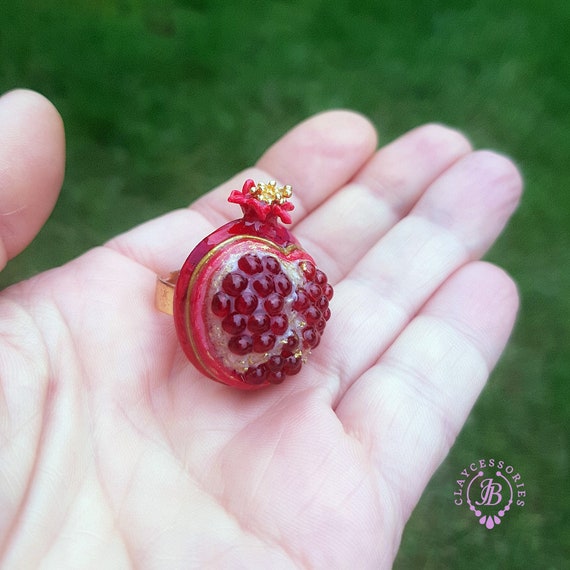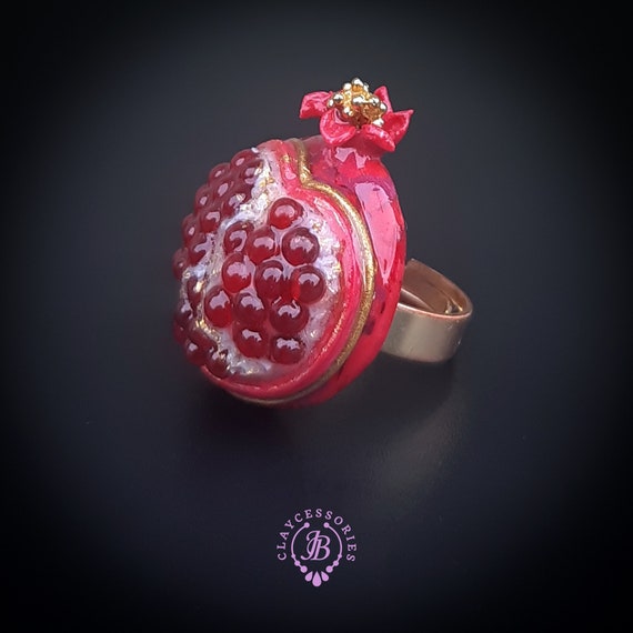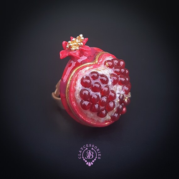 Pomegranate adjustable ring, bright, very light and shimmer in the sun, is the best gift for the Rosh Hashanah celebration. All details are sculpted and cut out of high-quality coloured polymer clay on a metal frame, the colours do not fade or fade in the sun. Single copy,100% Handmade OOAK ring. matching pendant: garnet pomegranate pendant pomegranate. matching bracelet: