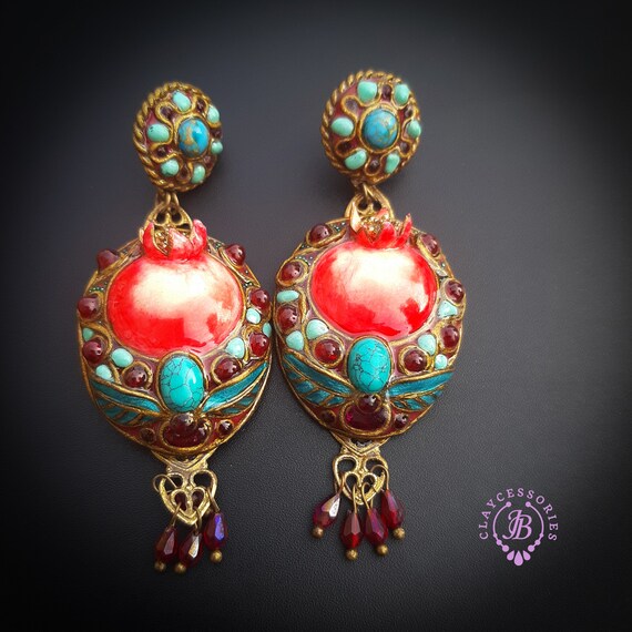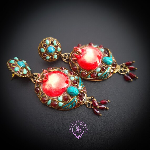 Pomegranate statement earrings in Art Nouveau style, bright, very light and shimmer in the sun, is the best gift for the Rosh Hashanah celebration. All details are sculpted and cut out of high-quality coloured polymer clay, decorated by natural gemstones. Single copy,100% Handmade OOAK earrings matching ring: pomegranate statement adjustable ring in. matching pendant: