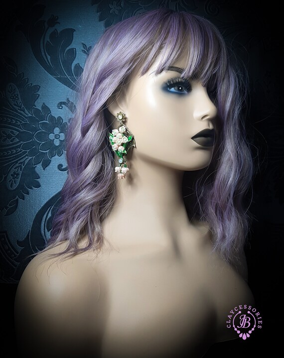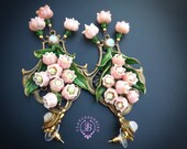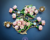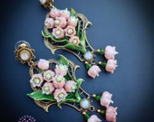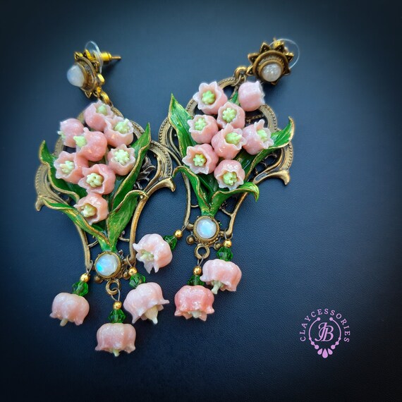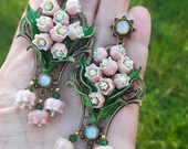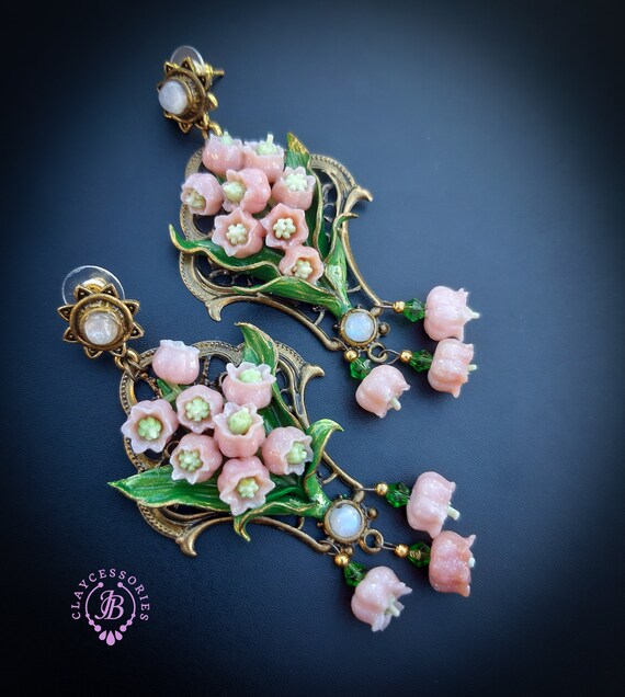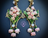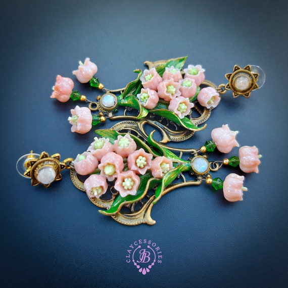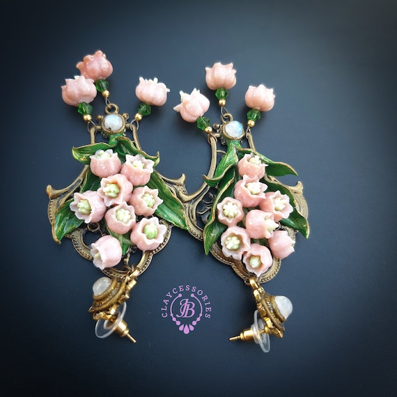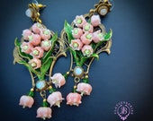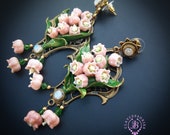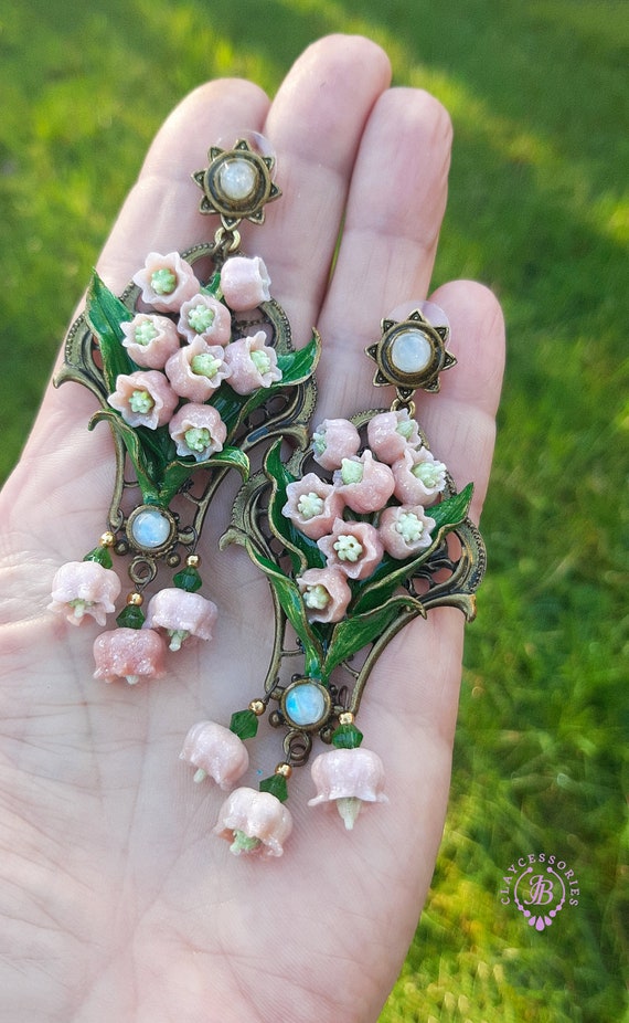 Pink lilies of the valley earrings in Art Nouveau style, gentle and very light weight. All details are sculpted and carved from high-quality colourful polymer clay, colours do not wash out and do not fade in the sun, decorated by natural Moonstone cabochons. Single copy,100% Handmade OOAK earrings. All items are shipped from my home within 1-3 business days after payment confirmation. Please, contact me with any questions. I make some custom orders. If you would like some items to be custom made or created for you in a special way, feel free to send an Etsy conversation with your requirements, and we can discuss them.