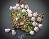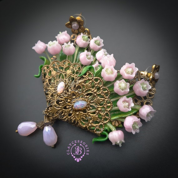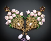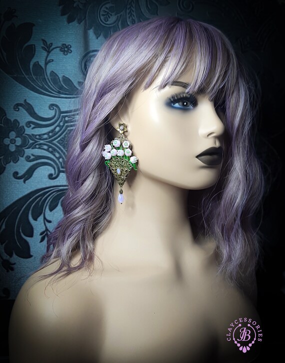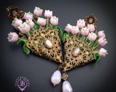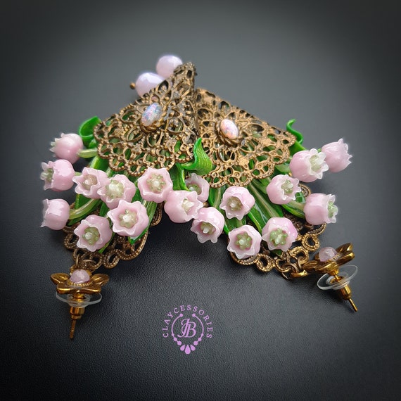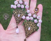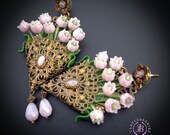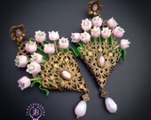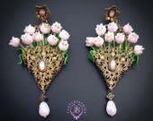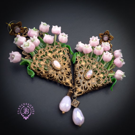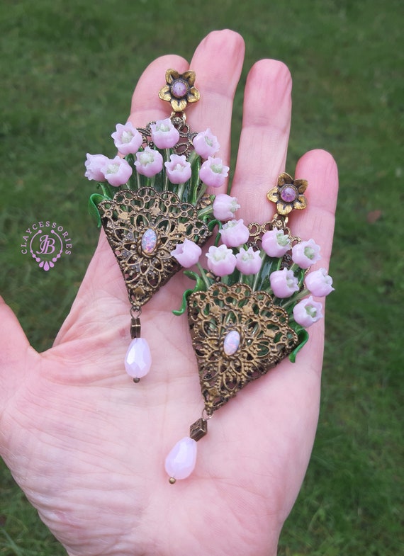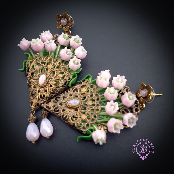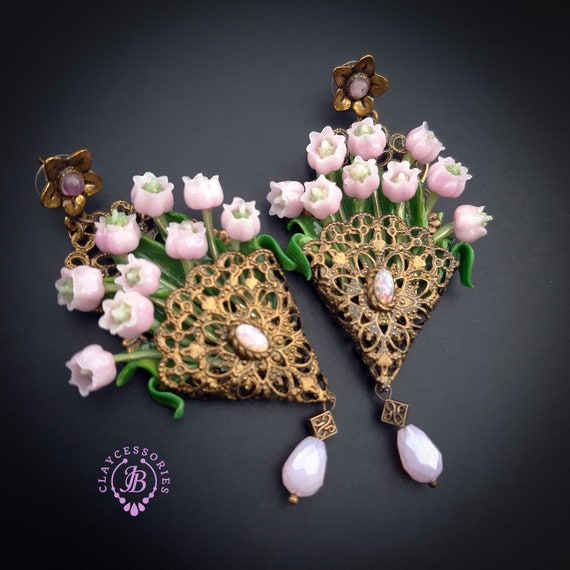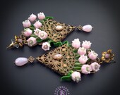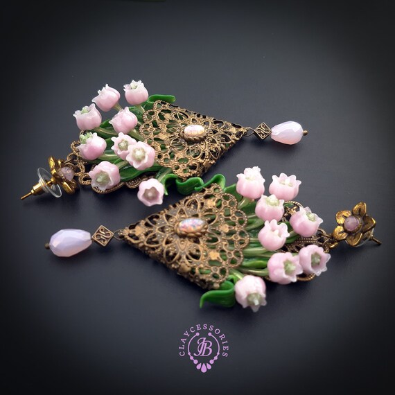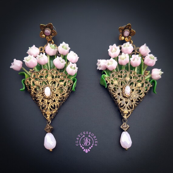 Pink lilies of the valley in basket earrings in Art Nouveau style, gentle and very light weight. All details are sculpted and carved from high-quality colourful polymer clay, colours do not wash out and do not fade in the sun, decorated by natural gemstones. Single copy,100% Handmade OOAK earrings. All items are shipped from my home within 1-3 business days after payment confirmation. Please, contact me with any questions. I make some custom orders. If you would like some items to be custom made or created for you in a special way, feel free to send an Etsy conversation with your requirements, and we can discuss them.