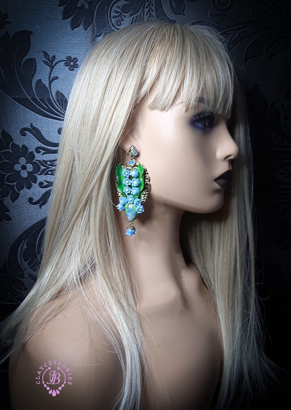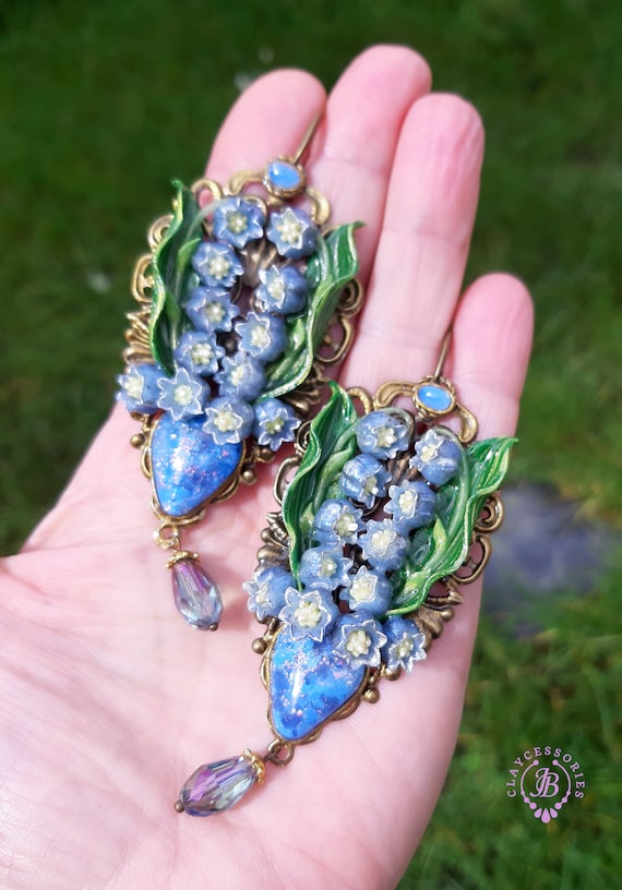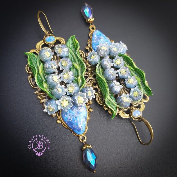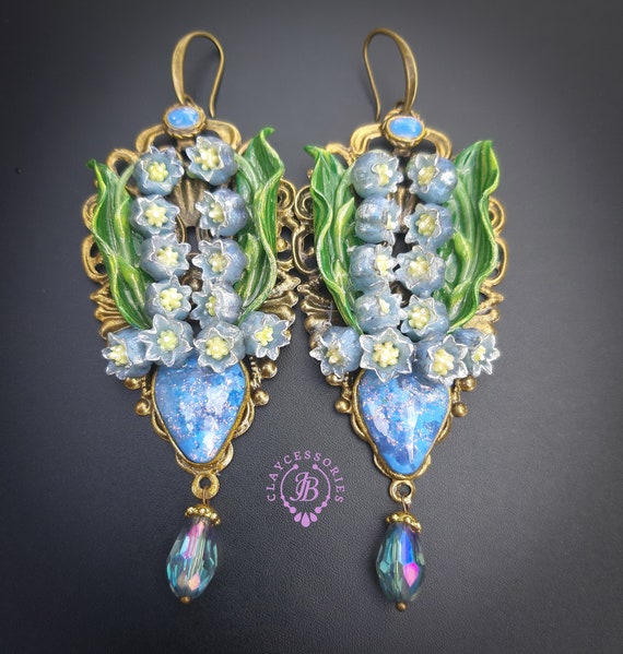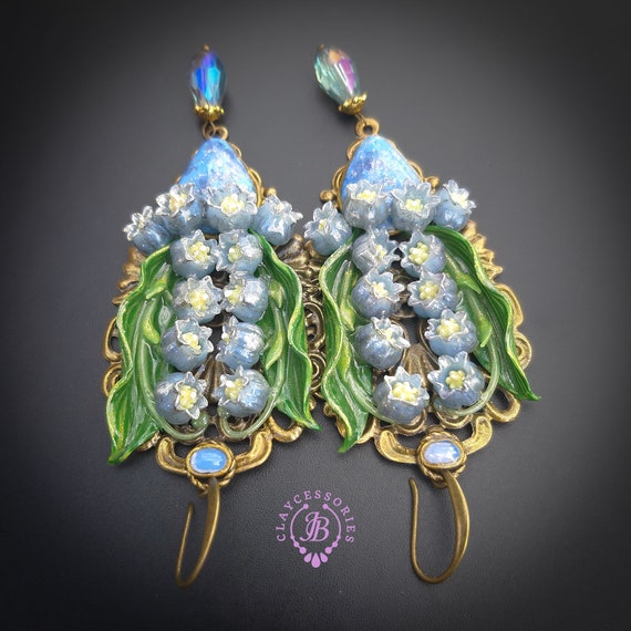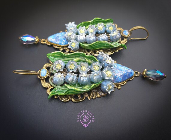 Blue lilies of the valley earrings in Art Nouveau style, gentle and very light weight. All details are sculpted and carved from high-quality colourful polymer clay, colours do not wash out and do not fade in the sun. Single copy,100% Handmade OOAK earrings. All items are shipped from my home within 1-3 business days after payment confirmation. Please, contact me with any questions. I make some custom orders. If you would like some items to be custom made or created for you in a special way, feel free to send an Etsy conversation with your requirements, and we can discuss them.