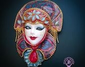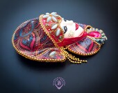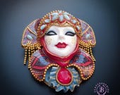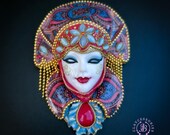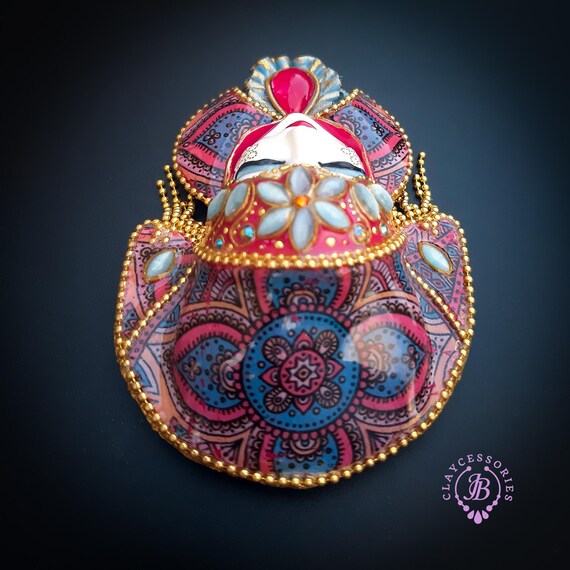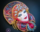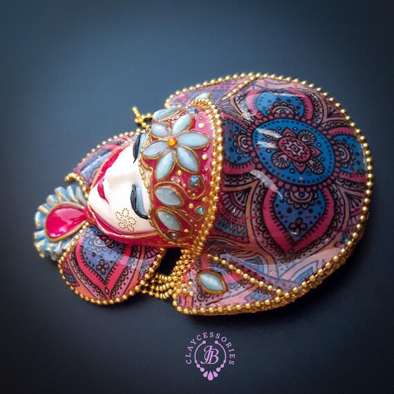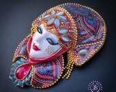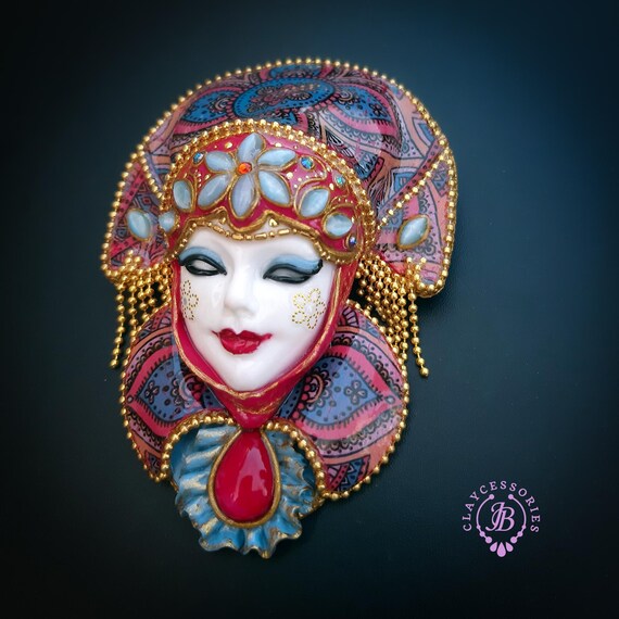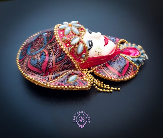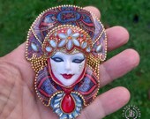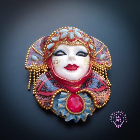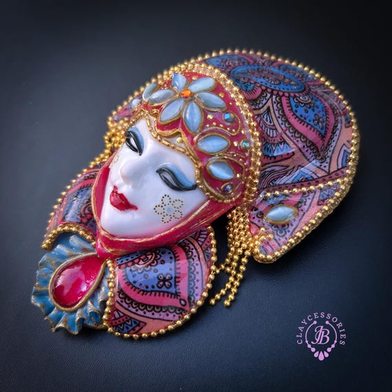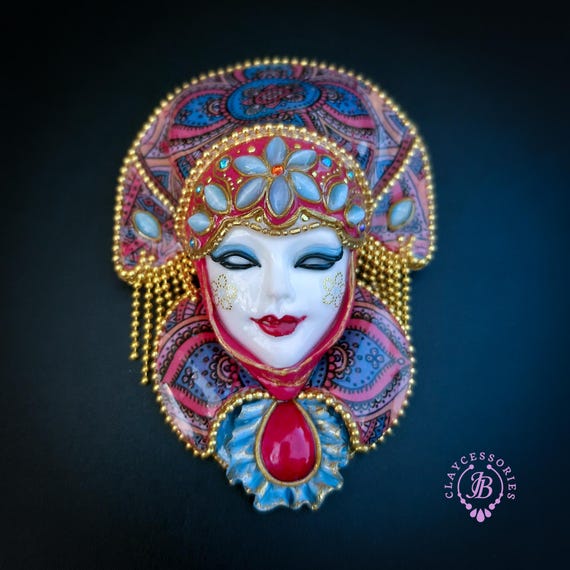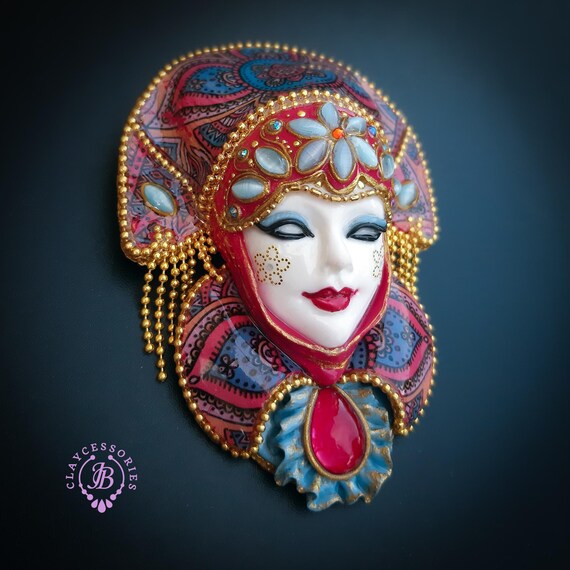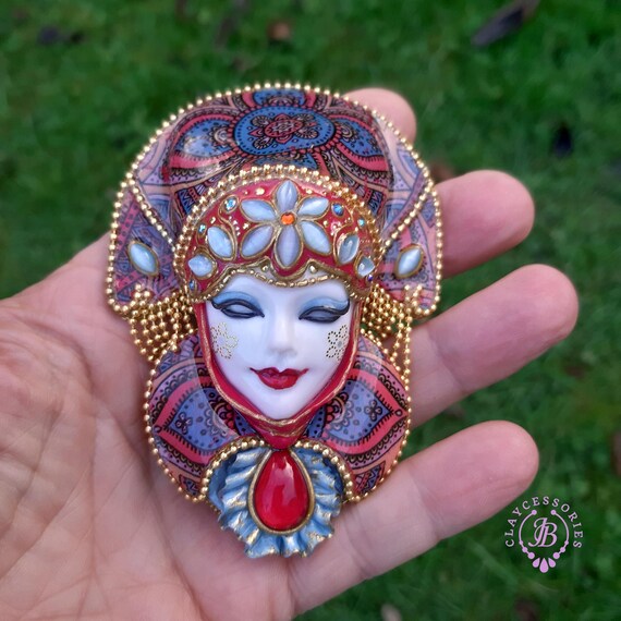 Russian Doll Venetian mask statement brooch in Art Nouveau style. All details are sculpted and carved from high-quality colourful polymer clay and coated with UV resin, colours don't wash out and don't fade in the sun. Single copy,100% Handmade OOAK brooch. Matching earrings: matryoshka venetian mask earrings in art. All items are shipped from my home within 1-3 business days after payment confirmation. Please, contact me with any questions. I make some custom orders. If you would like some items to be custom made or created for you in a special way, feel free to send an Etsy conversation with your requirements, and we can discuss them.