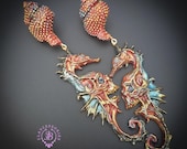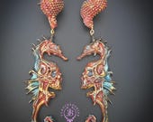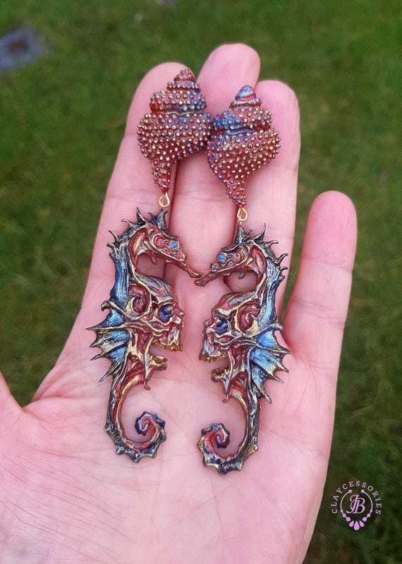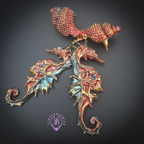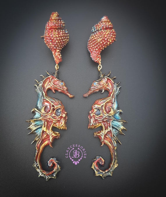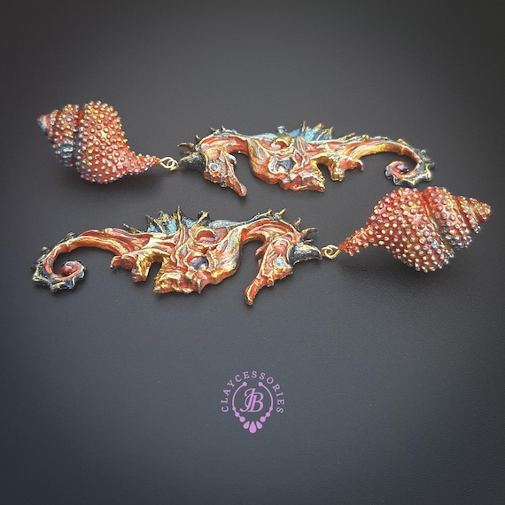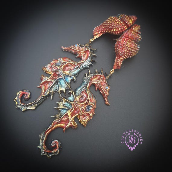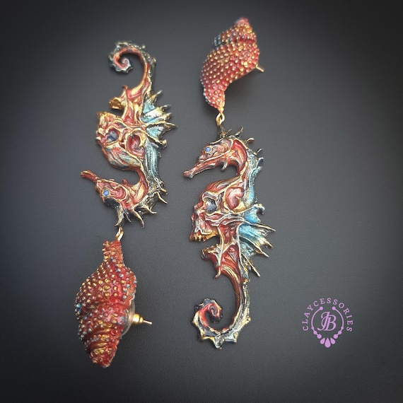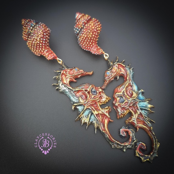 Seahorse statement earrings, all details are sculpted and carved from high-quality colourful polymer clay, colours do not wash out and do not fade in the sun. Single copy,100% Handmade OOAK earrings. All items are shipped from my home within 1-3 business days after payment confirmation. Please, contact me with any questions. I make some custom orders. If you would like some items to be custom made or created for you in a special way, feel free to send an Etsy conversation with your requirements, and we can discuss them.
