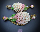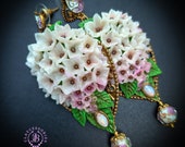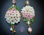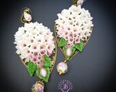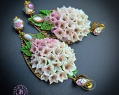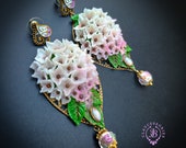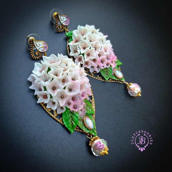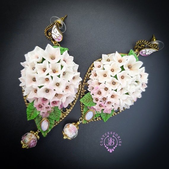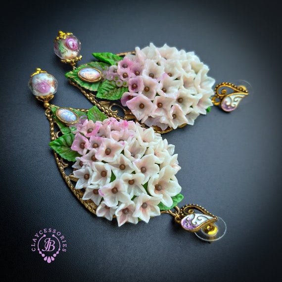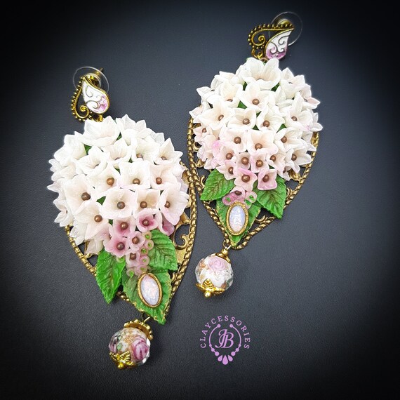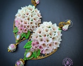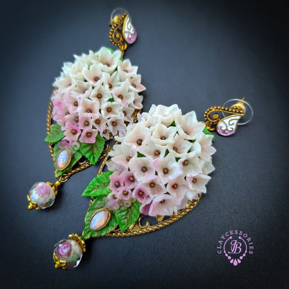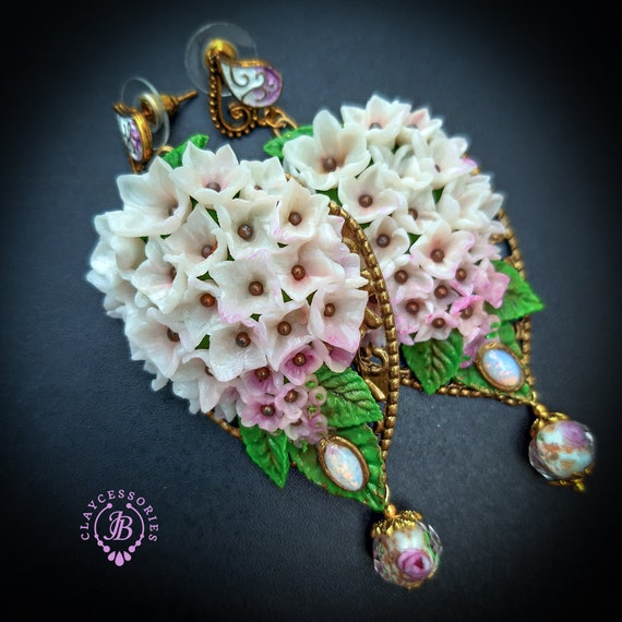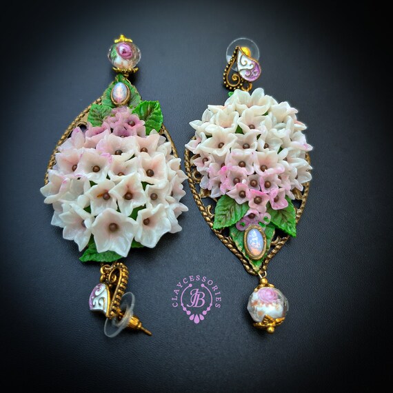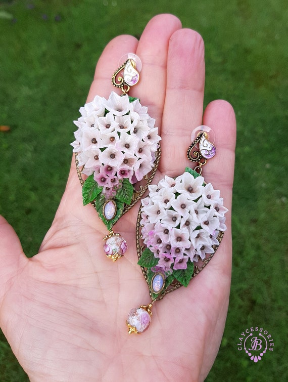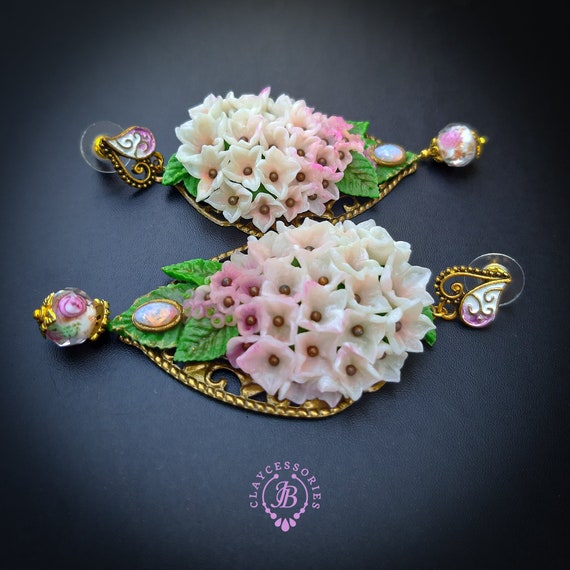 Hydrangea earrings in Art Nouveau style, all details sculpted and carved from high-quality colourful polymer clay, colours don't wash out and do not fade in the sun, decorated with natural gemstones. Single copy,100% Handmade OOAK earrings. All items are shipped from my home within 1-3 business days after payment confirmation. Please, contact me with any questions. I make some custom orders. If you would like some items to be custom made or created for you in a special way, feel free to send an Etsy conversation with your requirements, and we can discuss them.