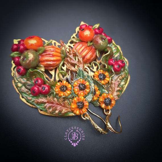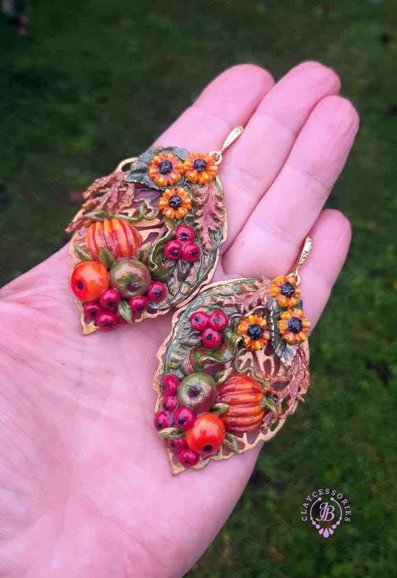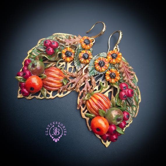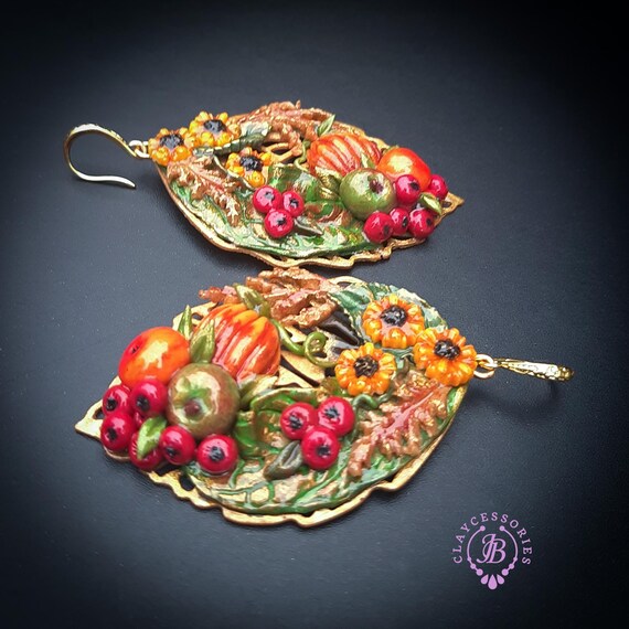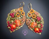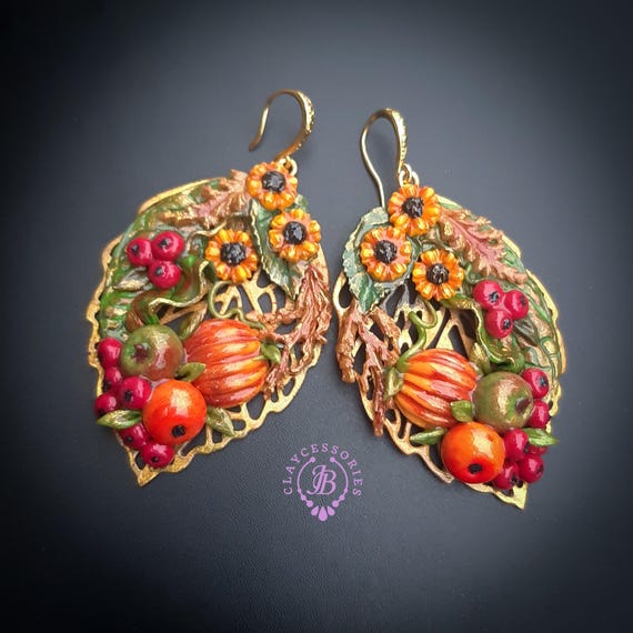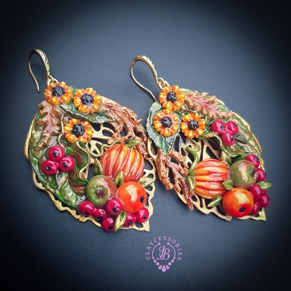Autumn harvest statement earrings, handcrafted from high quality polymer clay and filled with resin, colours will not wash out or fade in the sun. The perfect way to welcome autumn! They are a great Thanksgiving accessory, but can also be worn all autumn season. Single copy,100% Handmade OOAK earrings. All items are shipped from my home within 1-3 business days after payment confirmation. I make some custom orders. If you would like some items to be custom made or created for you in a special way, feel free to send an Etsy conversation with your requirements, and we can discuss them.
