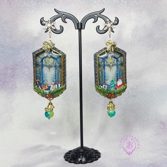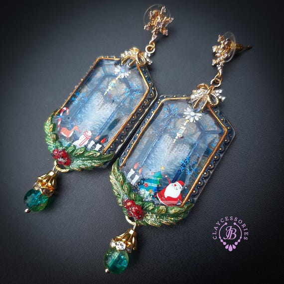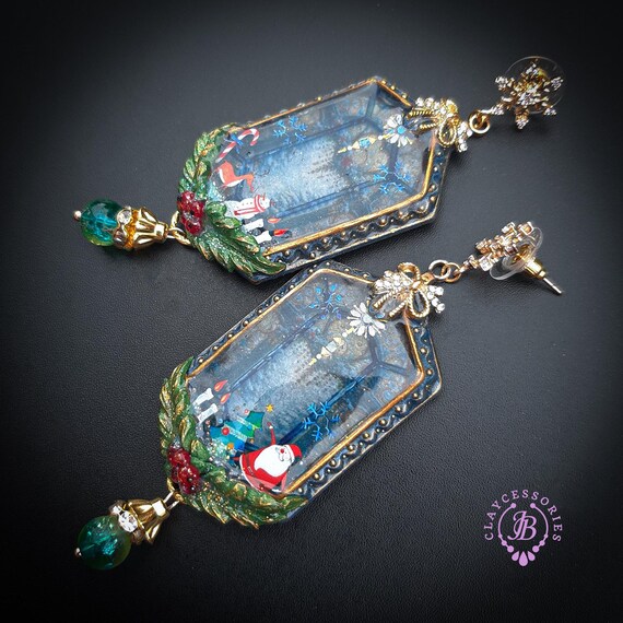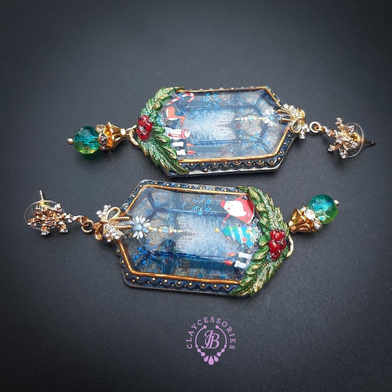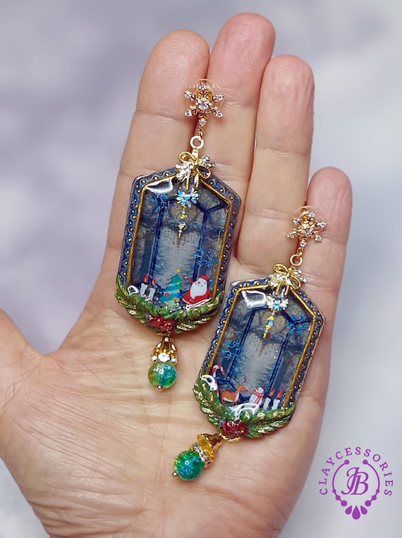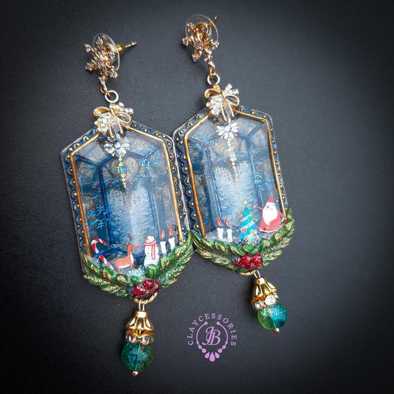 Christmas Holiday windows statement earrings, made using mixed media, polymer clay and UV resin, unique design and best choice for Christmas gift! All details are sculpted and carved from high-quality colourful polymer clay, colours do not wash out and do not fade in the sun. Single copy,100% Handmade OOAK earrings. All items are shipped from my home within 1-3 business days after payment confirmation. Please, contact with me any questions. I make some custom orders. If you would like some items to be custom made or created for you in a special way, feel free to send an Etsy conversation with your requirements, and we can discuss them.