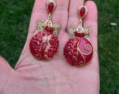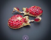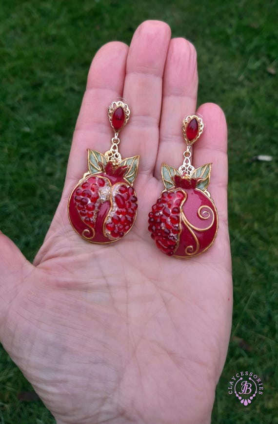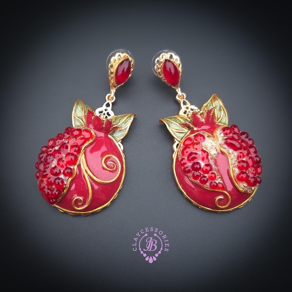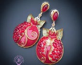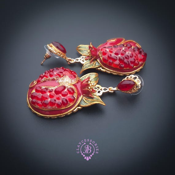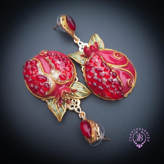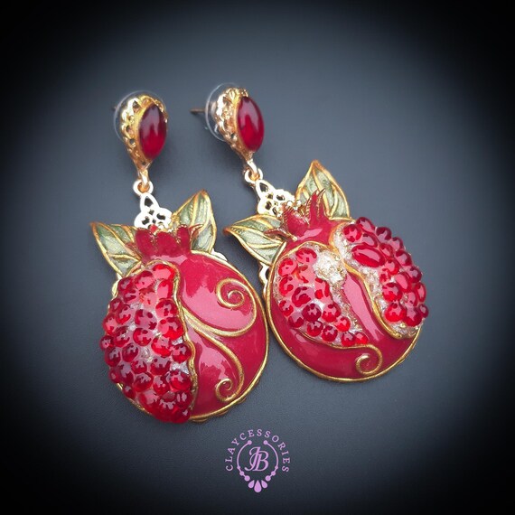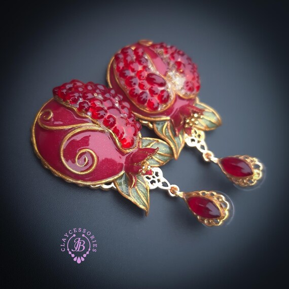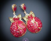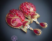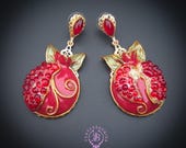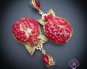 Pomegranate dangle earrings in Art Nouveau style, bright and shimmer in the sun. All details sculpted and carved from high-quality colourful polymer clay on filigree metal base, colours do not wash out and do not fade in the sun, coated by UV resin. Single copy,100% Handmade OOAK earrings matching necklace: persephone pomegranate necklace in art. All items are shipped from my home within 1-3 business days after payment confirmation. Please, contact me with any questions. I make some custom orders. If you would like some items to be custom made or created for you in a special way, feel free to send an Etsy conversation with your requirements, and we can discuss them.