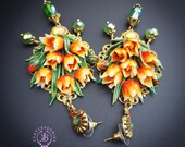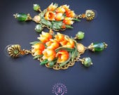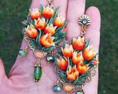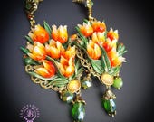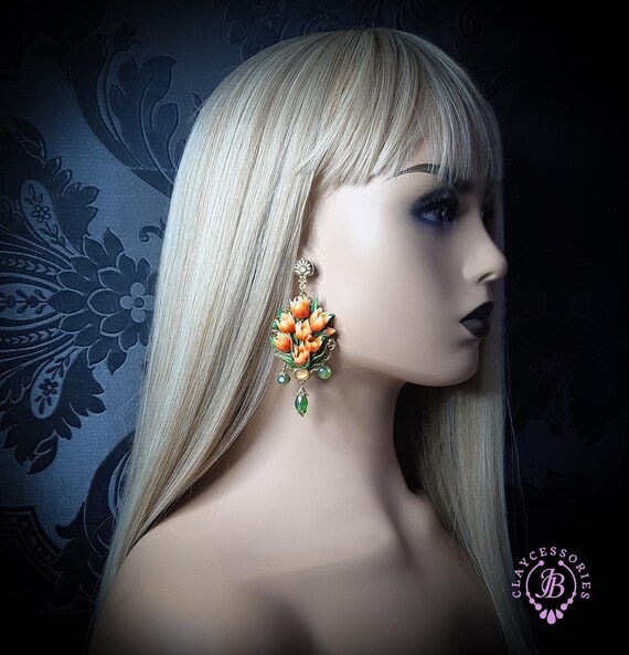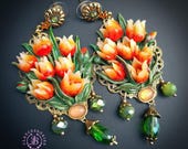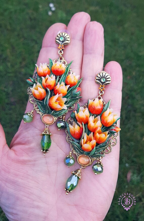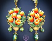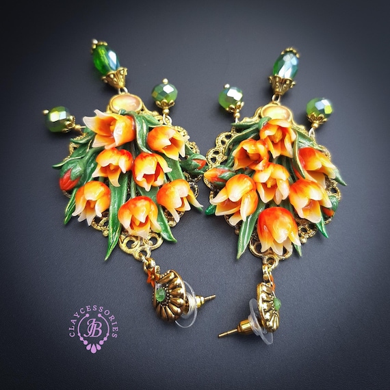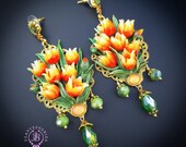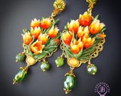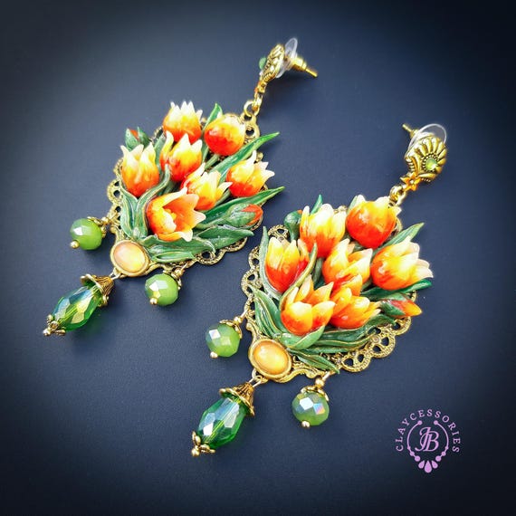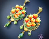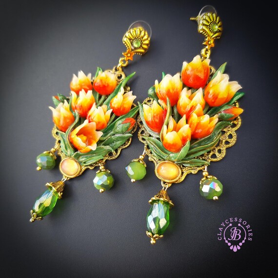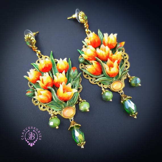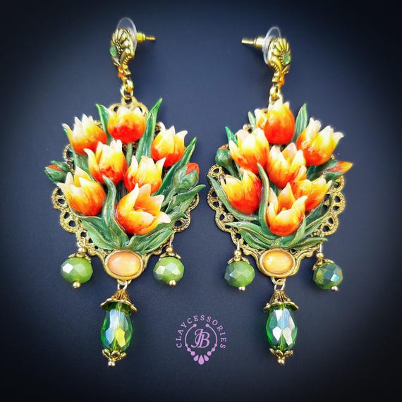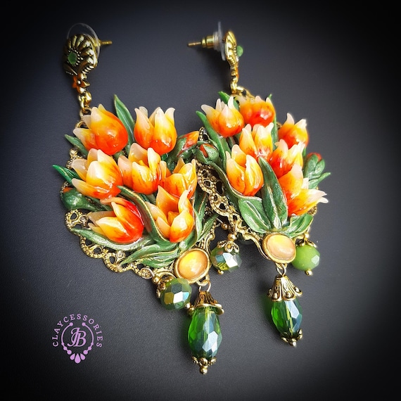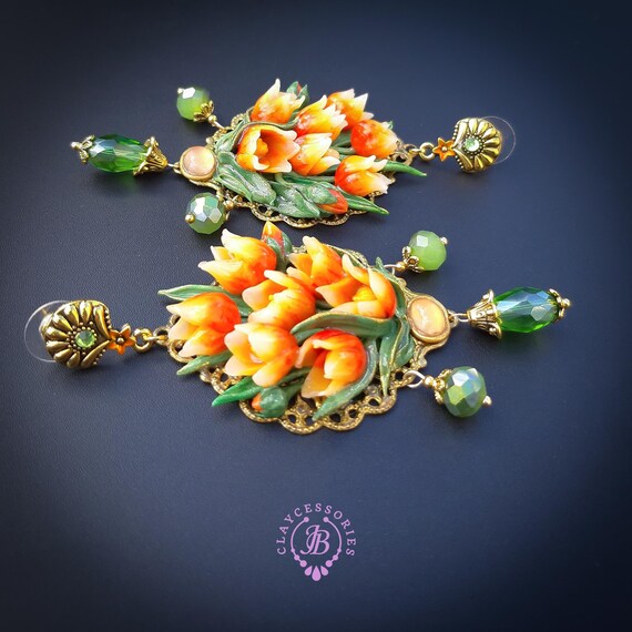 Tulips earrings in Art Nouveau style, gentle and very light weight. All details are sculpted and carved from high-quality colourful polymer clay, colours do not wash out and do not fade in the sun, decorated by natural gemstones. Single copy,100% Handmade OOAK earrings. All items are shipped from my home within 1-3 business days after payment confirmation. Please, contact me with any questions. I make some custom orders. If you would like some items to be custom made or created for you in a special way, feel free to send an Etsy conversation with your requirements, and we can discuss them.