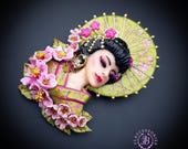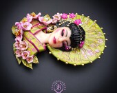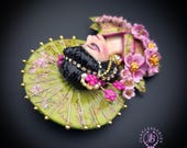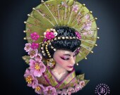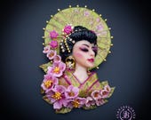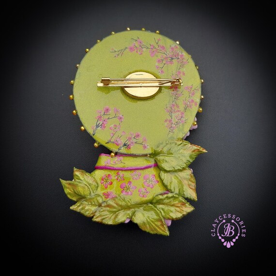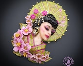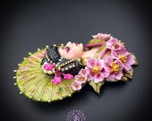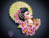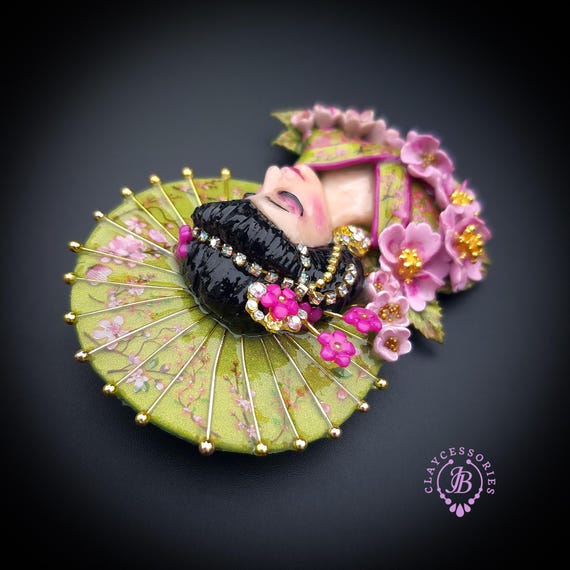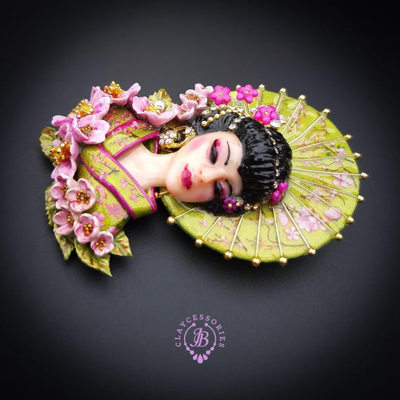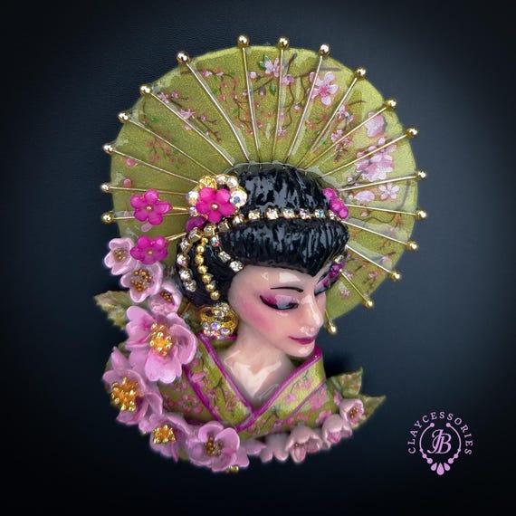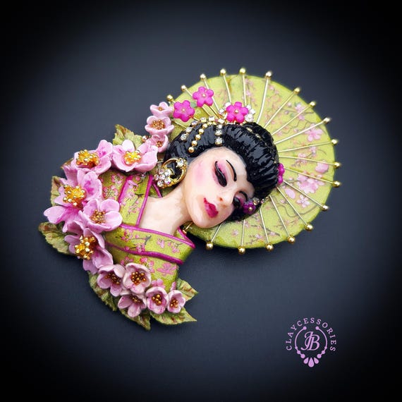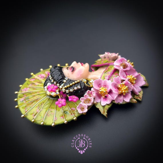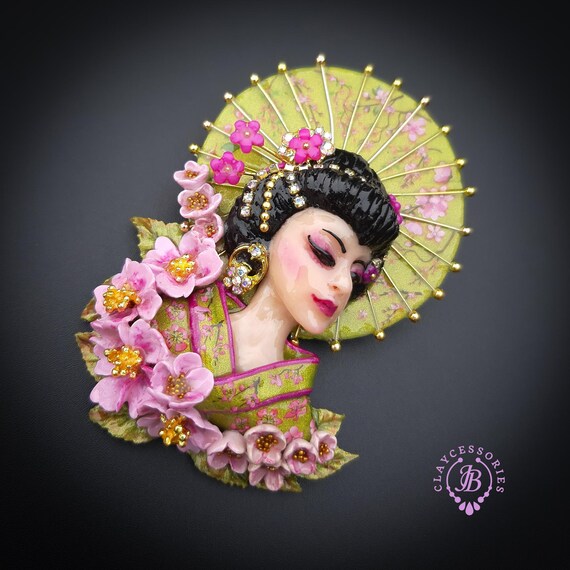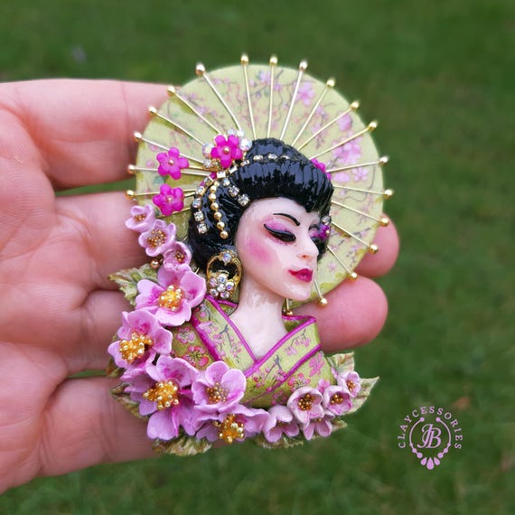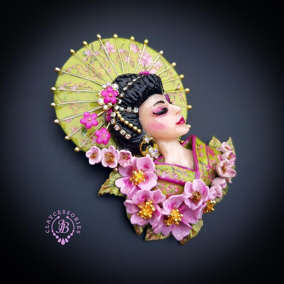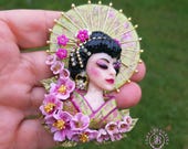 Geisha in cherry blossoms statement brooch, all details are sculpted and carved by hand from high-quality colourful polymer clay , colours do not wash out and do not fade in the sun. Brooch advisable to attach it to thick fabric. Single copy,100% Handmade OOAK brooch. All items are shipped from my home within 1-3 business days after payment confirmation. Please, contact me with any questions. I make some custom orders. If you would like some items to be custom made or created for you in a special way, feel free to send an Etsy conversation with your requirements, and we can discuss them.