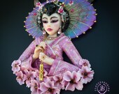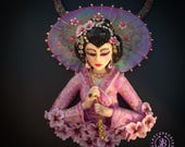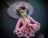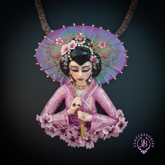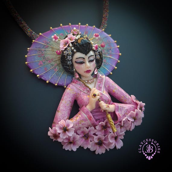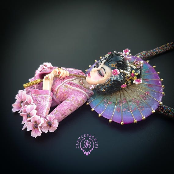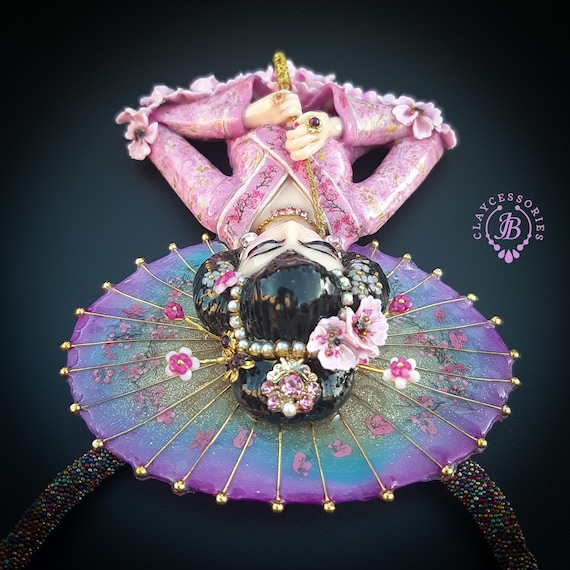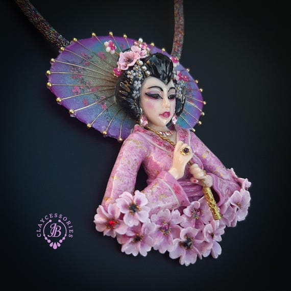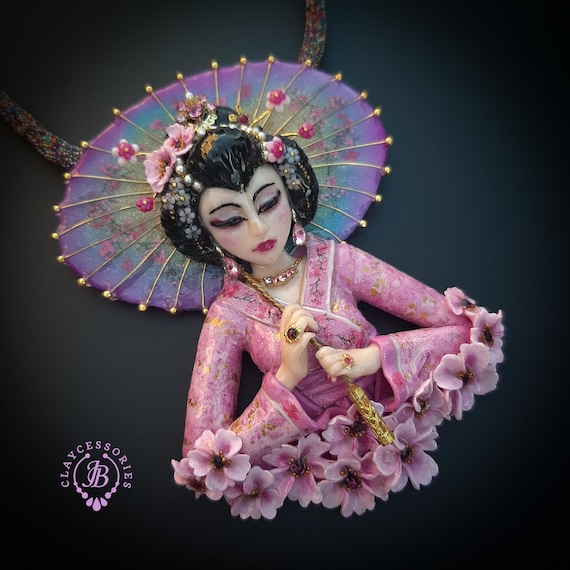 Geisha in cherry blossoms statement necklace, all details are sculpted and carved by hand from high-quality colourful polymer clay , colours do not wash out and do not fade in the sun. Single copy,100% Handmade OOAK necklace. All items are shipped from my home within 1-3 business days after payment confirmation. Please, contact me with any questions. I make some custom orders. If you would like some items to be custom made or created for you in a special way, feel free to send an Etsy conversation with your requirements, and we can discuss them.