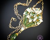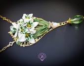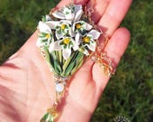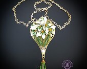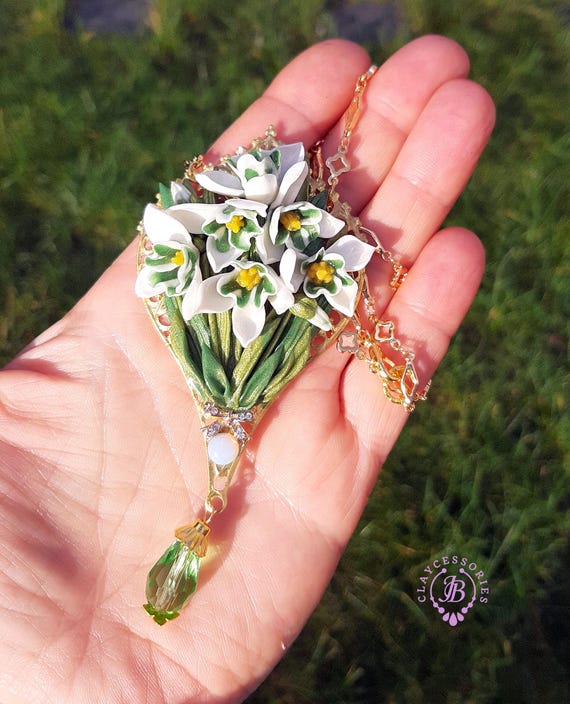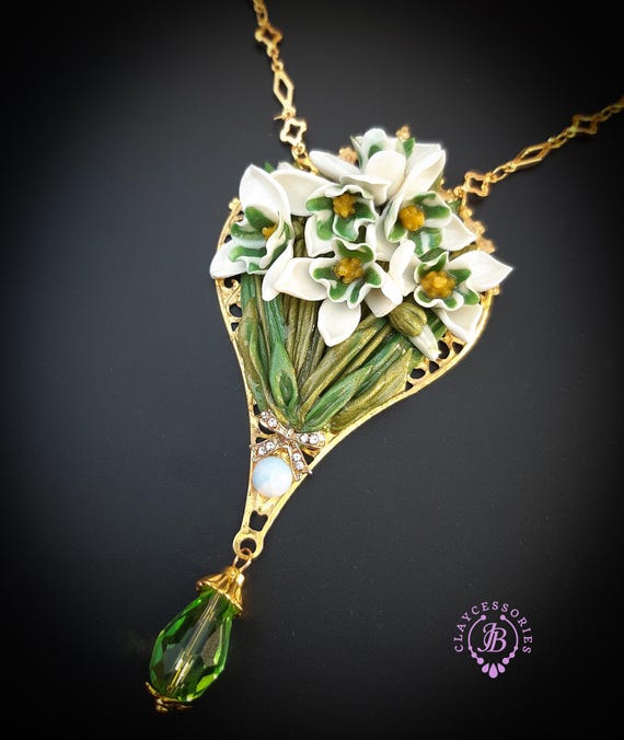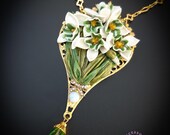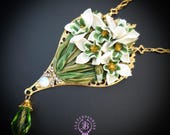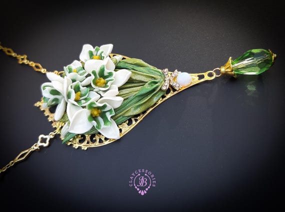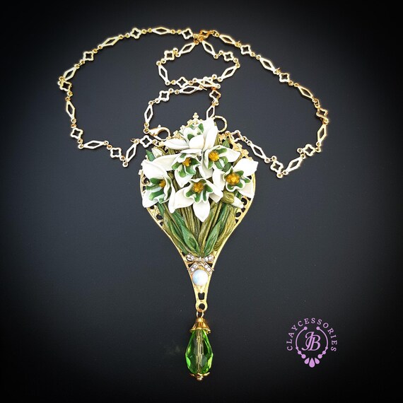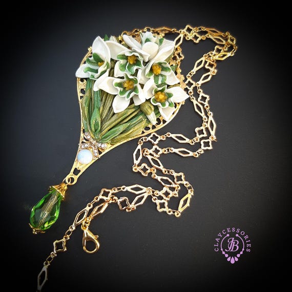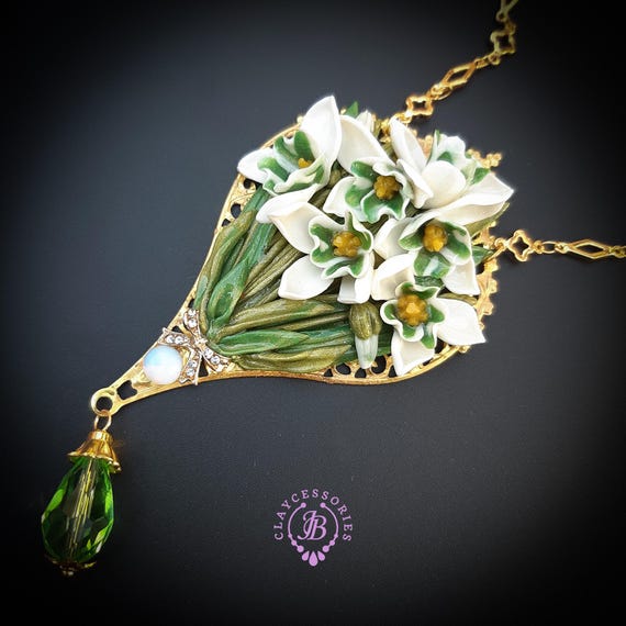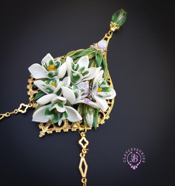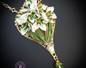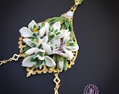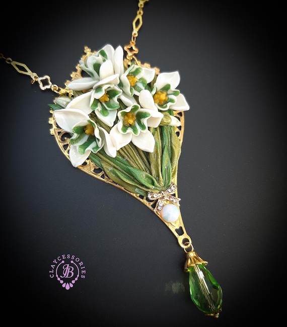 Snowdrops flowers pendant in Art Nouveau style, very lightweight and delicate. All details sculpted and carved from high-quality colourful polymer clay on metal base, colours do not wash out and do not fade in the sun. Single copy,100% Handmade OOAK pendant. matching earrings: snowdrops earrings in art nouveau style. All items are shipped from my home within 1-3 business days after payment confirmation. Please, contact me with any questions. I make some custom orders. If you would like some items to be custom made or created for you in a special way, feel free to send an Etsy conversation with your requirements, and we can discuss them.