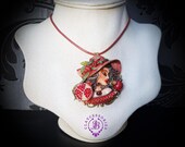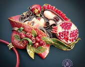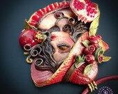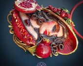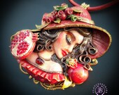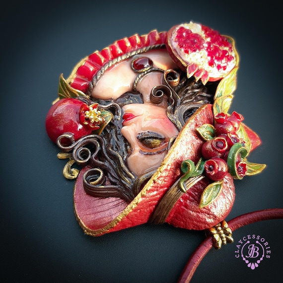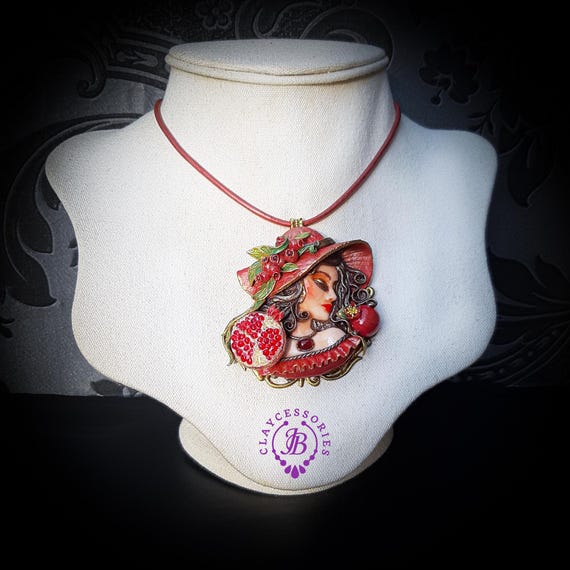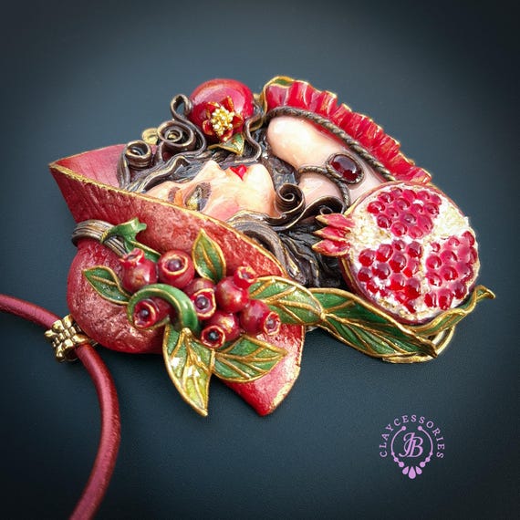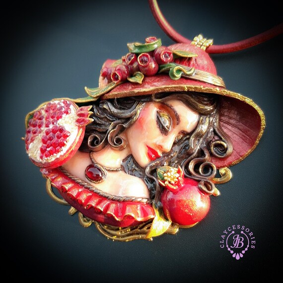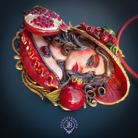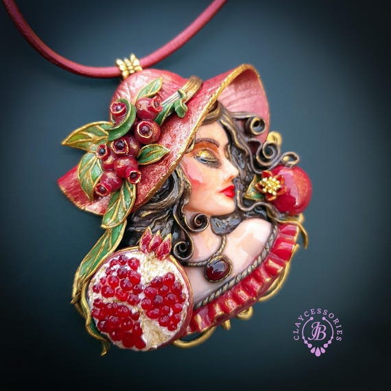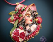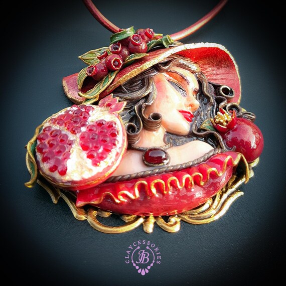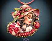 Lady with Pomegranate necklace in Art Nouveau style, is the best gift for the Rosh Hashanah celebration, decorated by Garnet gems and beads. All details are sculpted and cut out of high-quality coloured polymer clay on a metal frame, the colours do not fade or fade in the sun, decorated by Garnet beads. Single copy,100% Handmade OOAK pendant. I make some custom orders. If you would like some items to be custom made or created for you in a special way, feel free to send an Etsy conversation with your requirements, and we can discuss them.