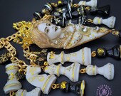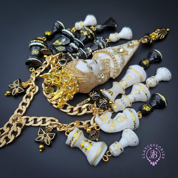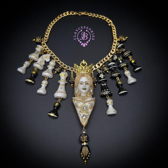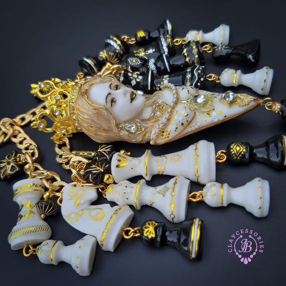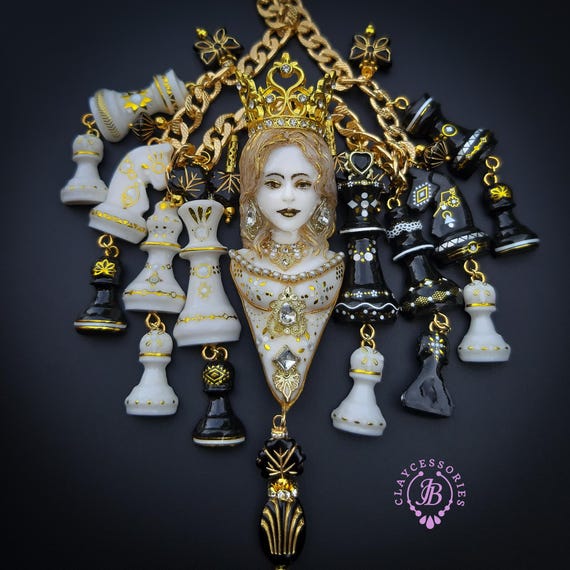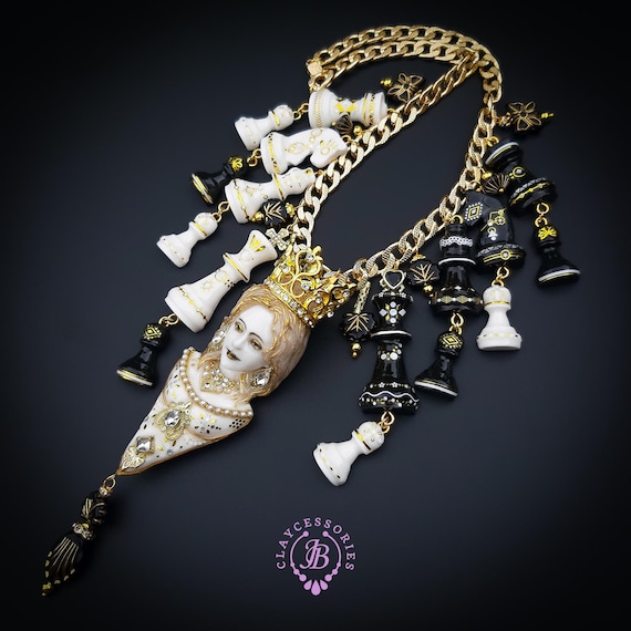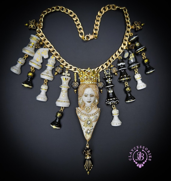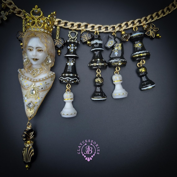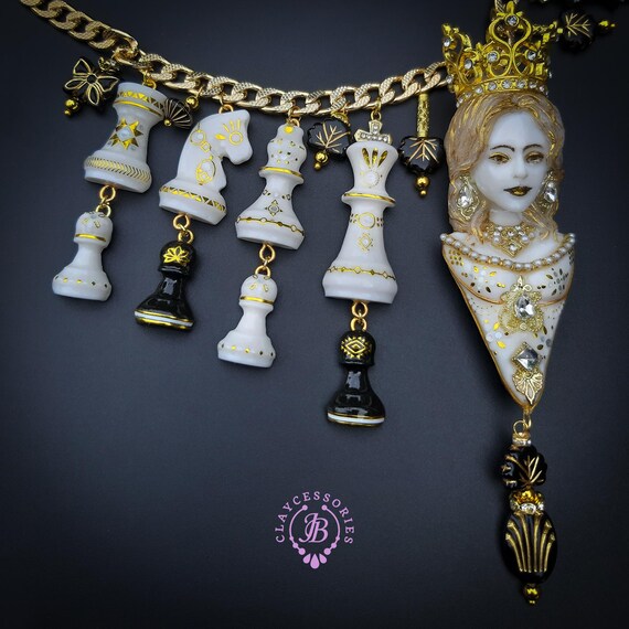 Queen Chess statement necklace, all details sculpted and carved from high-quality colourful polymer clay, colours do not wash out and do not fade in the sun. Single copy,100% Handmade OOAK necklace. All items are shipped from my home within 1-3 business days after payment confirmation. Please, contact me with any questions. I make some custom orders. If you would like some items to be custom made or created for you in a special way, feel free to send an Etsy conversation with your requirements, and we can discuss them.