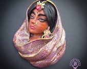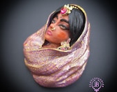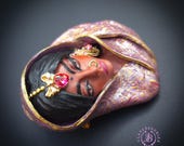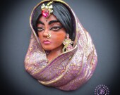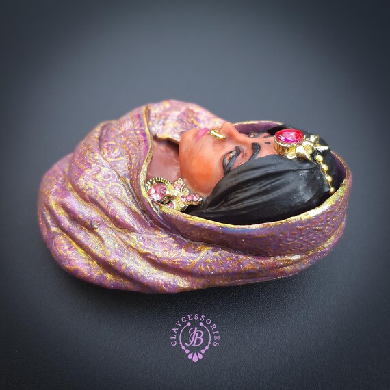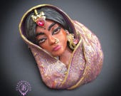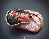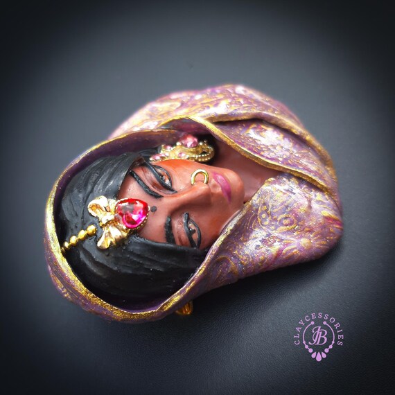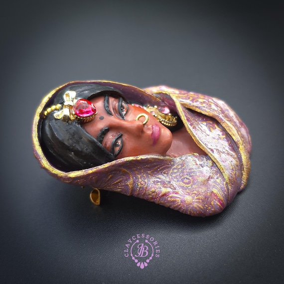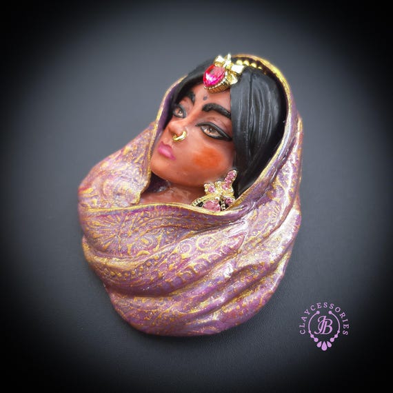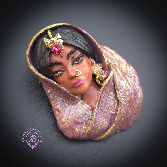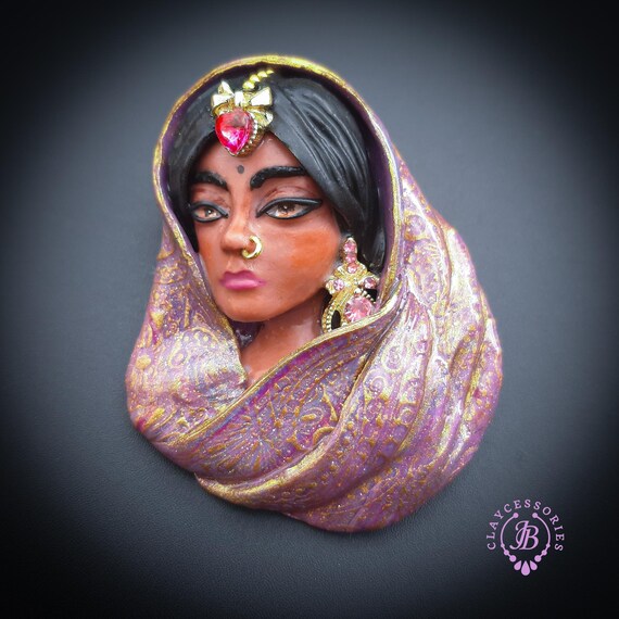 Stunning handcrafted brooch featuring a beautifully detailed Indian woman. This unique piece showcases intricate artistry, capturing the essence of traditional beauty with modern flair. The brooch depicts a woman adorned with traditional jewellery, including a nose ring and a sparkling gem on her forehead, all framed by a flowing scarf. Perfectly sized to make a statement without overwhelming your outfit. All details sculpted and carved from high quality colourful polymer clay , colours do not wash out and do not fade in the sun. Single copy,100% Handmade OOAK brooch All items are shipped from my home within 1-3 business days after payment confirmation. Please, contact me for any questions. I make some custom orders. If you would like some items to be custom made or created for you in a special way, feel free to send an Etsy conversation with your requirements, and we can discuss them.