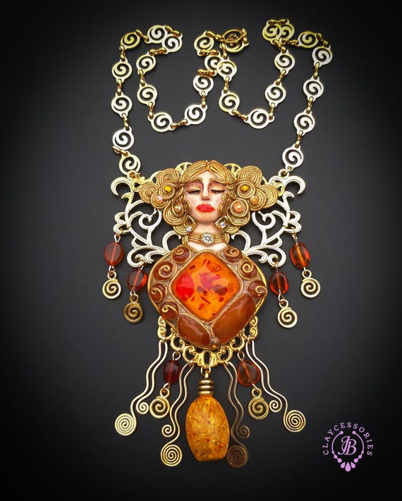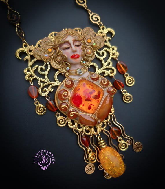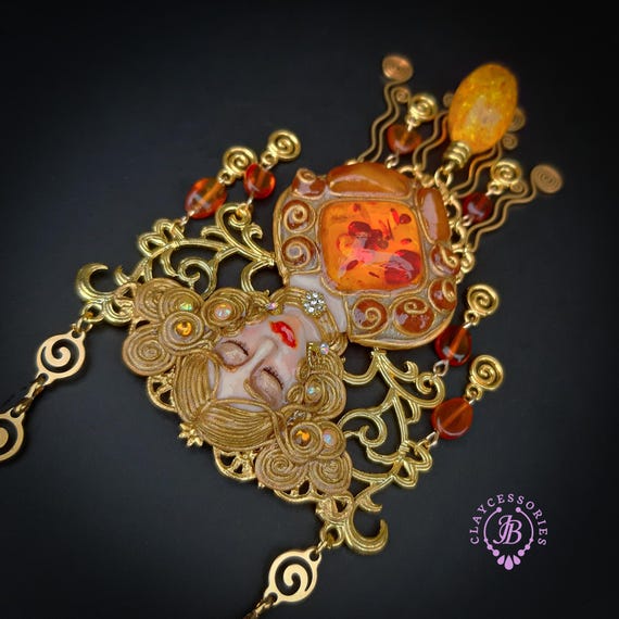 Elevate your style with this stunning Klimt-Inspired Necklace, a perfect blend of artistic flair and elegance. Handcrafted with love, this unique piece features a beautifully detailed woman adorned in golden tones, capturing the essence of Gustav Klimt's iconic art. Embrace your individuality and celebrate your love for art with this Klimt-Inspired Necklace. Whether for yourself or as a gift, it's a beautiful addition to any jewellery collection. Single copy, 100% Handmade OOAK necklace. All items are shipped from my home within 1-3 business days after payment confirmation. Please, contact me with any questions. I make some custom orders. If you would like some items to be custom made or created for you in a special way, feel free to send an Etsy conversation with your requirements, and we can discuss them.