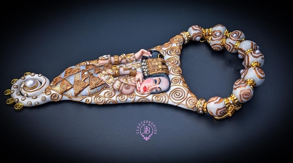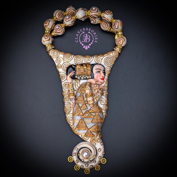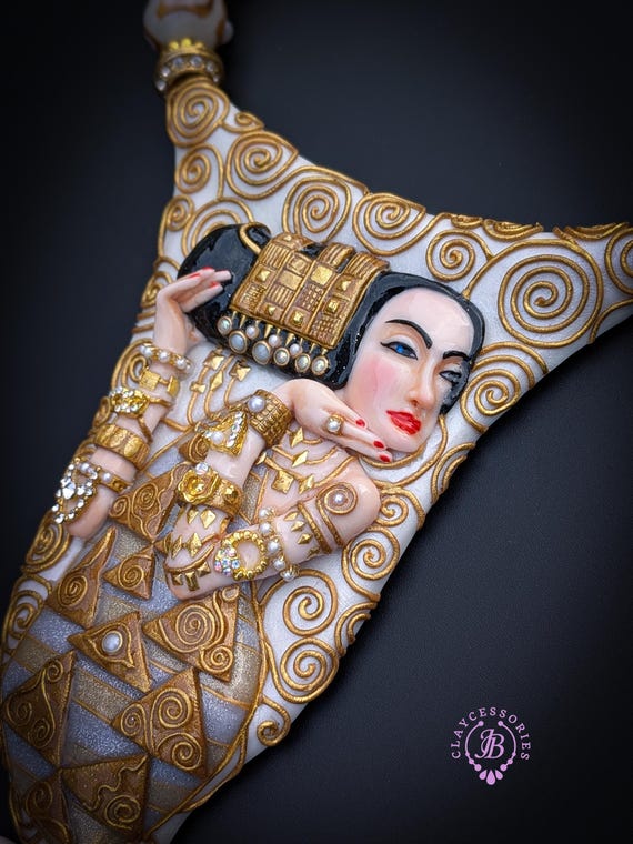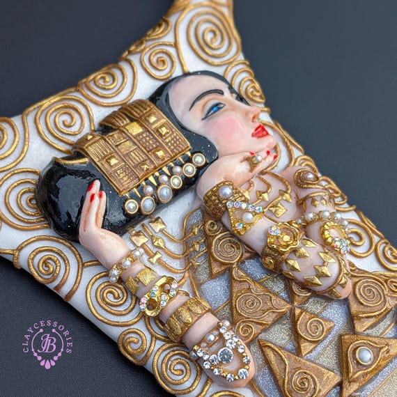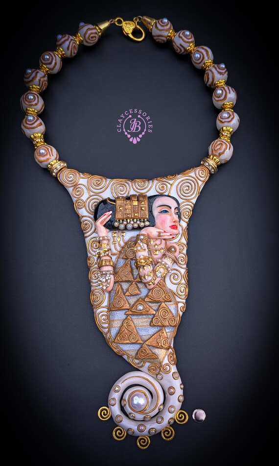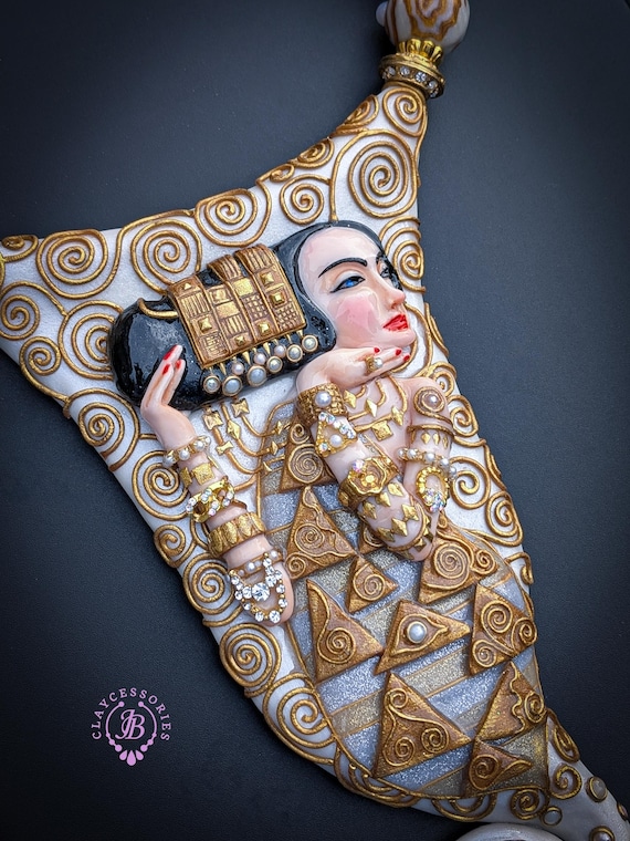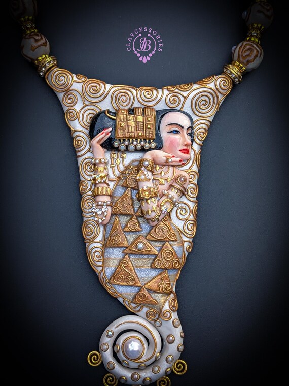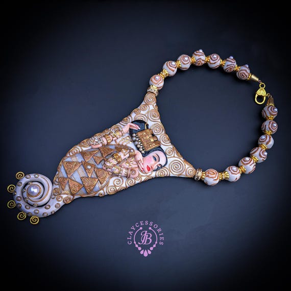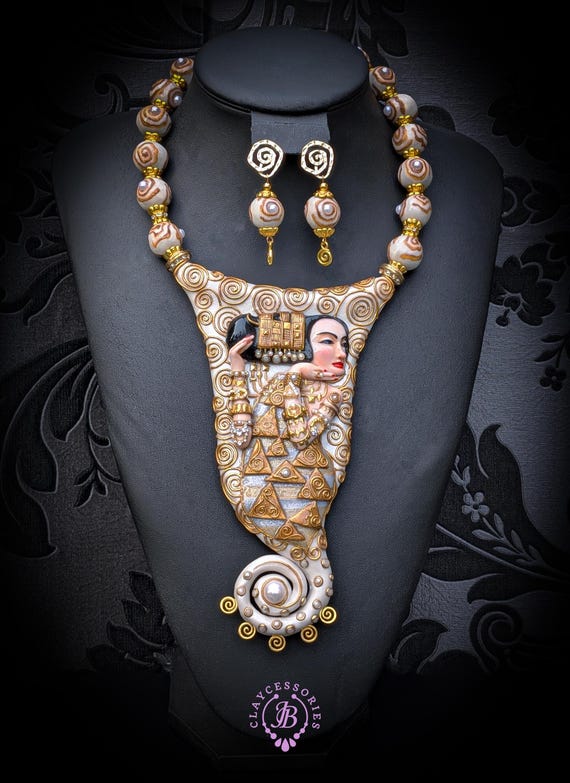 Elevate your style with this breathtaking Klimt-inspired necklace, a stunning homage to the iconic art of Gustav Klimt. This unique piece beautifully combines intricate detailing and vibrant colors, capturing the essence of Klimt's masterpiece "Expectation" (fragment). This Klimt-inspired necklace not only celebrates artistic beauty but also serves as an eye-catching accessory for anyone looking to express their unique style. Add a touch of elegance to your collection today! Earrings are included as a gift. All items are shipped from my home within 1-3 business days after payment confirmation. Please, contact with me for any questions. I make some custom orders. If you would like some items to be custom made or created for you in a special way, feel free to send an Etsy conversation with your requirements, and we can discuss them.