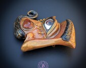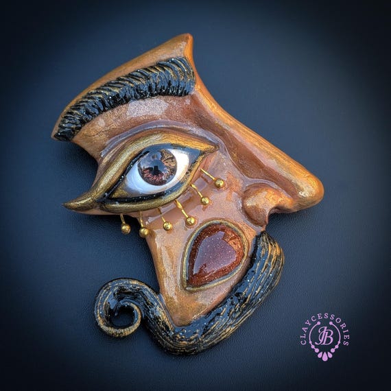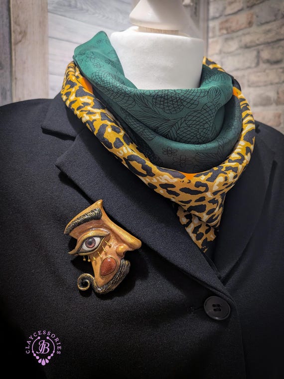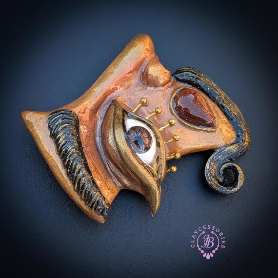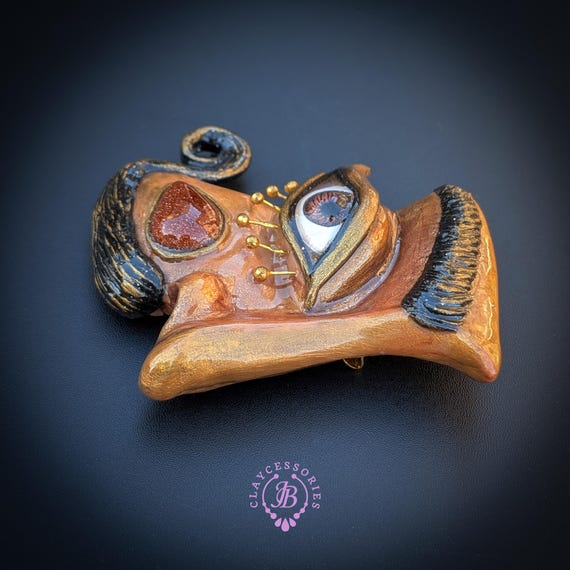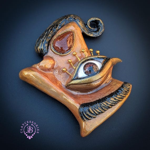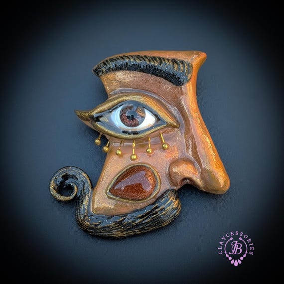 Beautifully inspired by the surreal artistry of Salvador Dalí, this statement brooch captures the essence of dreaming and imagination. Crafted with intricate details, the piece features a whimsical face adorned with an expressive eye, mustache, and elegant golden accents that evoke Dalí's unique style. Perfect for layering on jackets, blouses, or bags, this brooch adds a striking touch to any outfit.Ideal for art lovers, collectors, or anyone who appreciates bold fashion statements. Single copy,100% Handmade OOAK brooch. All items are shipped from my home within 1-3 business days after payment confirmation. Please, contact me with any questions. I make some custom orders. If you would like some items to be custom made or created for you in a special way, feel free to send an Etsy conversation with your requirements, and we can discuss them.