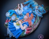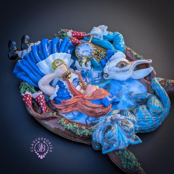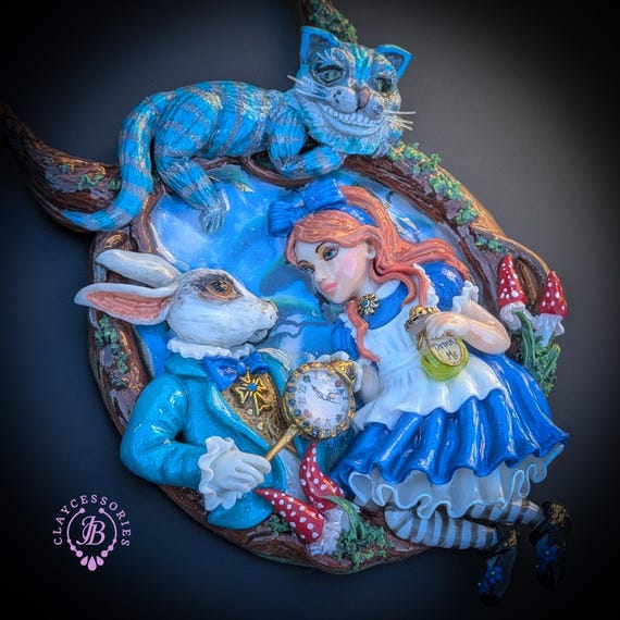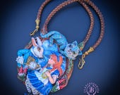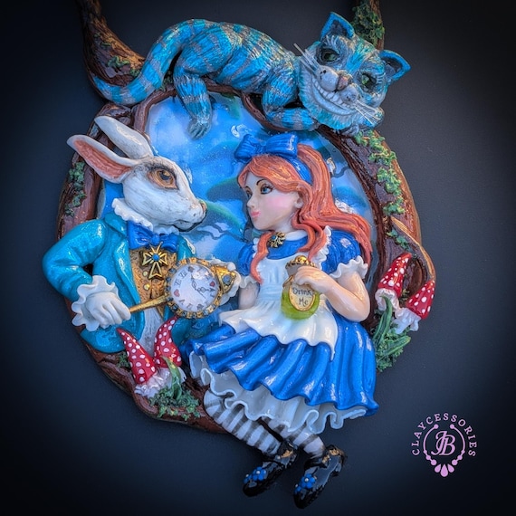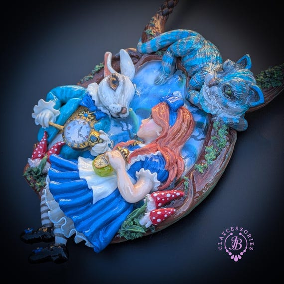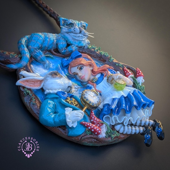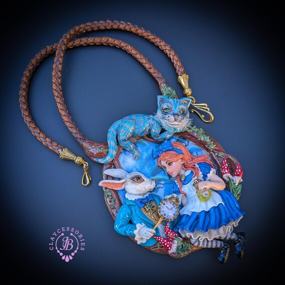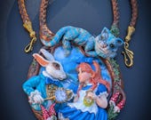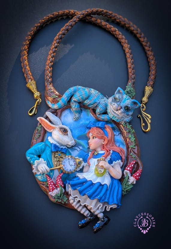 Fall down the rabbit hole with this enchanting Alice in Wonderland statement necklace, a true wearable work of art. Featuring a beautifully sculpted scene of Alice and the White Rabbit, this necklace captures a magical moment from Wonderland, complete with the Rabbit’s pocket watch, Alice’s iconic blue dress, and charming woodland details. Perched above the scene is the mischievous Cheshire Cat, adding depth, movement, and storybook charm. The pendant is framed by a textured, vine-like border and paired with a rich braided cord necklace finished with ornate gold-tone clasps for a secure and elegant fit. Single copy,100% Handmade OOAK necklace. All items are shipped from my home within 1-3 business days after payment confirmation. Please, contact me for any questions. I make some custom orders. If you would like some items to be custom made or created for you in a special way, feel free to send an Etsy conversation with your requirements, and we can discuss them.