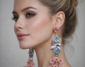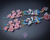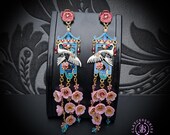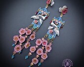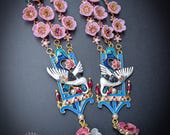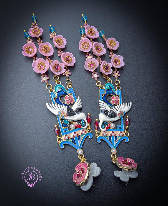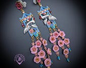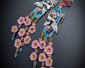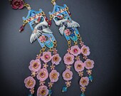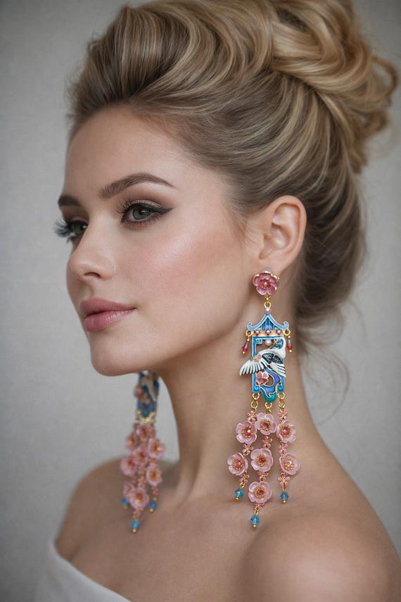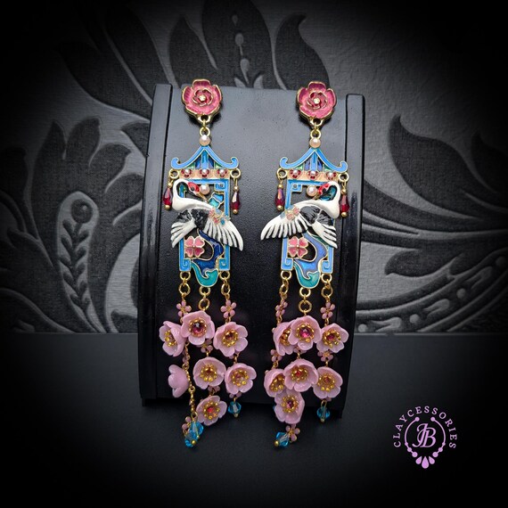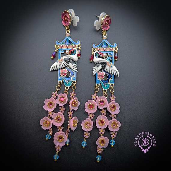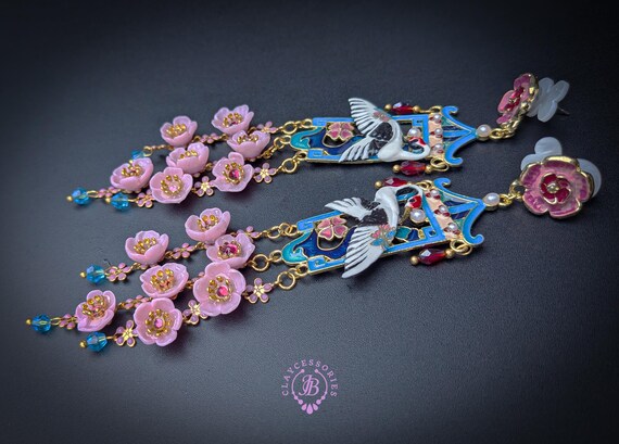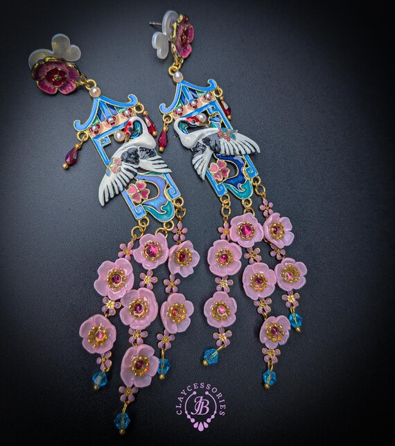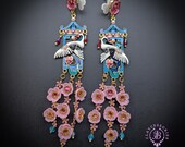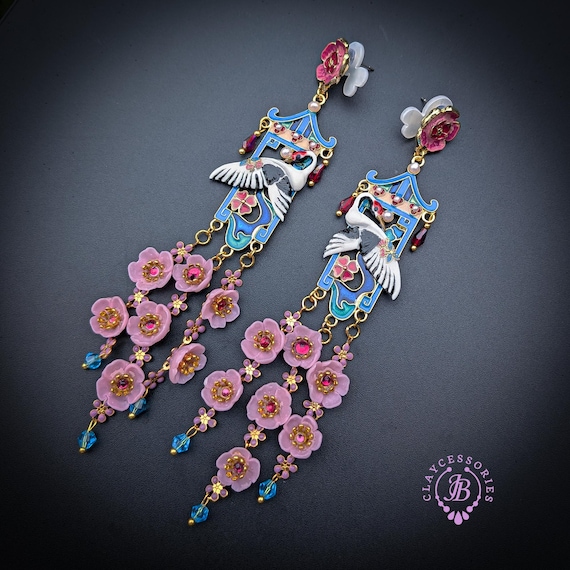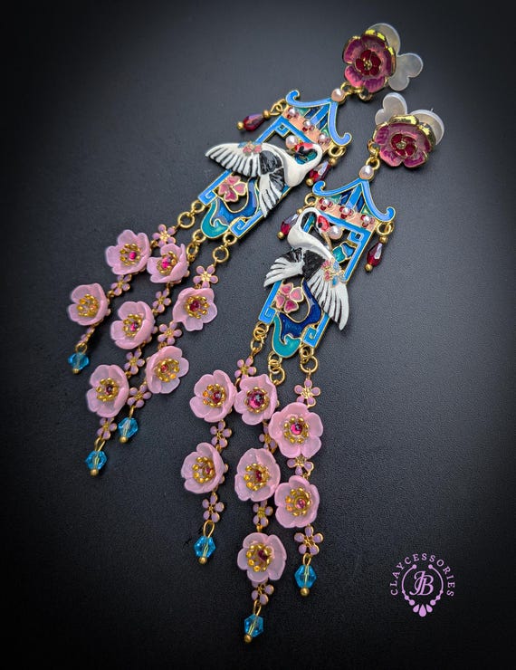 Graceful cranes meet cascading cherry blossoms in these breathtaking statement earrings inspired by traditional Asian artistry. Featuring delicately detailed white cranes set against vibrant blue enamel panels, these earrings are adorned with pink floral accents, ruby-toned crystals, and cascading translucent blossoms that sway beautifully with every movement. The intricate gold-tone framework and pagoda-inspired silhouette add a regal, heirloom-quality touch. Romantic, feminine, and undeniably eye-catching — these earrings are perfect for special occasions, weddings, cultural celebrations, or anyone who loves bold wearable art.