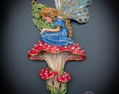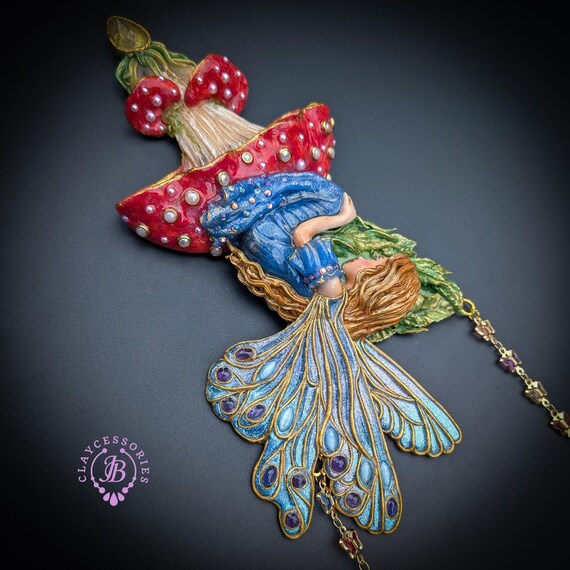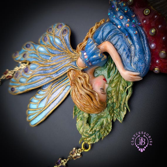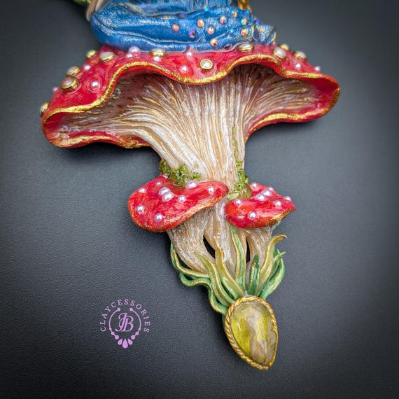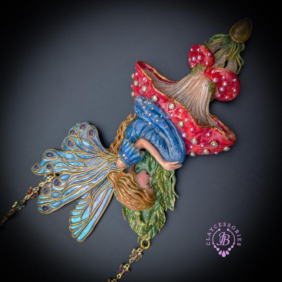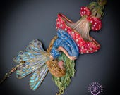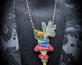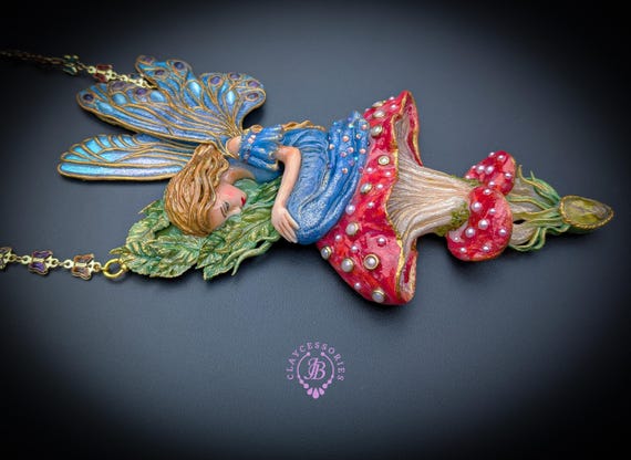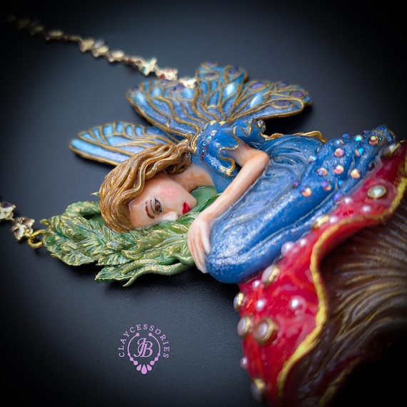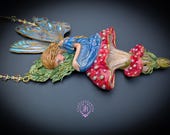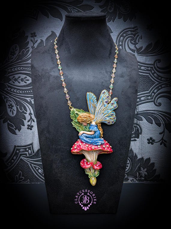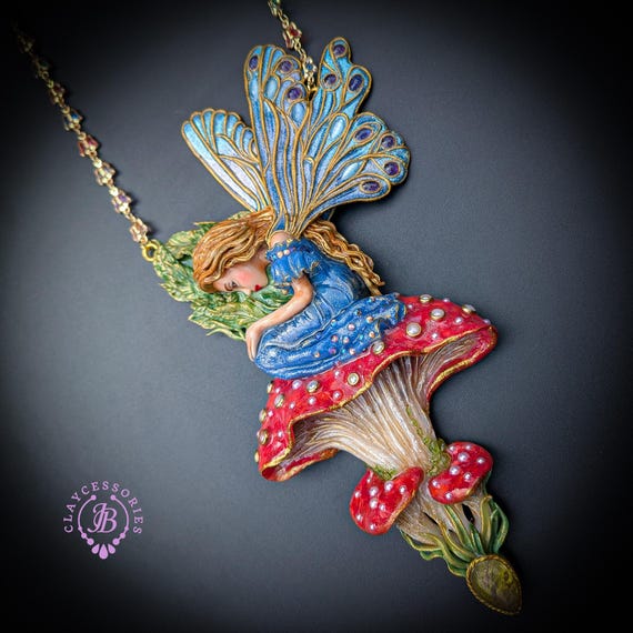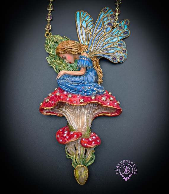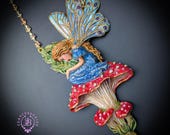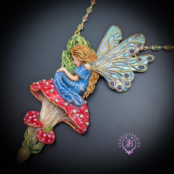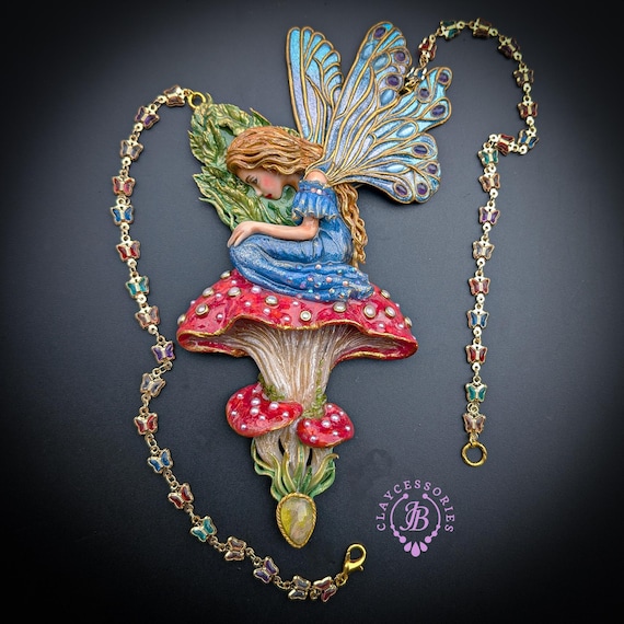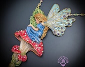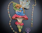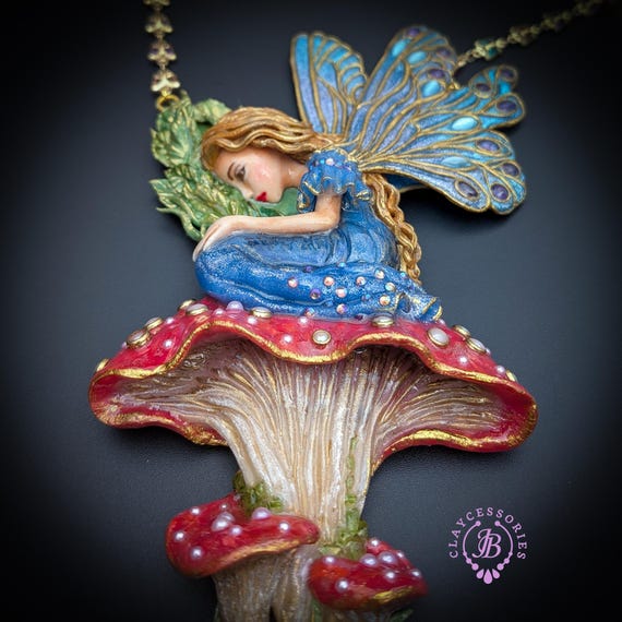 Add a touch of magic to your jewelry collection with this enchanting fairy necklace. Featuring a beautifully detailed fairy resting on a vibrant mushroom, this piece captures the charm of woodland fantasy and nature-inspired design. The colorful pendant showcases delicate wings, intricate textures, and a dreamy pose that makes it a true statement piece. Perfect for lovers of fairycore, cottagecore, and whimsical aesthetics.