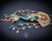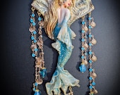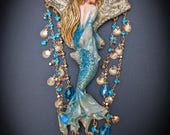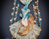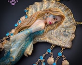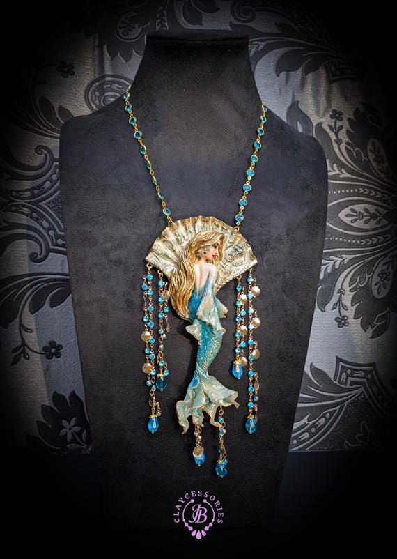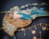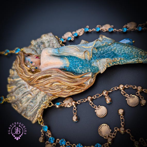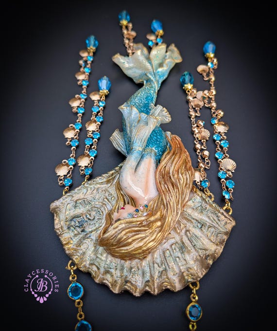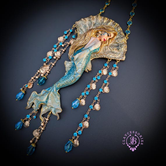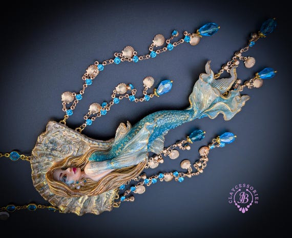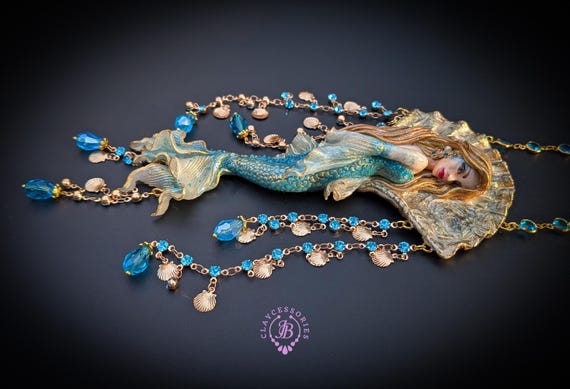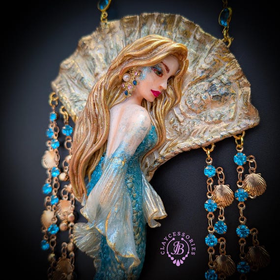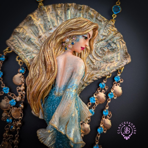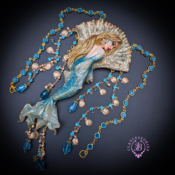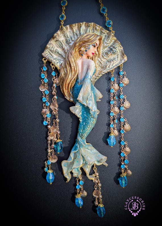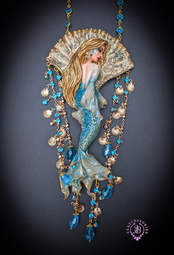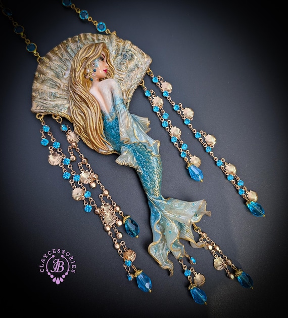 Fantasy Mermaid Art Necklace – Ocean-Inspired Handmade Jewelry Bring a touch of ocean magic to your style with this stunning handmade mermaid necklace. Featuring an intricately sculpted mermaid design, this wearable piece of art captures the beauty and mystery of the sea.The mermaid is adorned in shimmering blue tones with delicate details that highlight her flowing hair and elegant tail. Surrounding her are sparkling blue crystal beads and charming seashell accents, creating a rich, ocean-inspired composition that moves beautifully when worn. This necklace is perfect for lovers of fantasy, the ocean, and unique artisan jewelry. Whether you're dressing up for a special occasion or adding a statement piece to your everyday look, this mermaid necklace will make you feel truly magical.