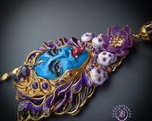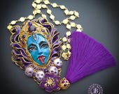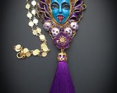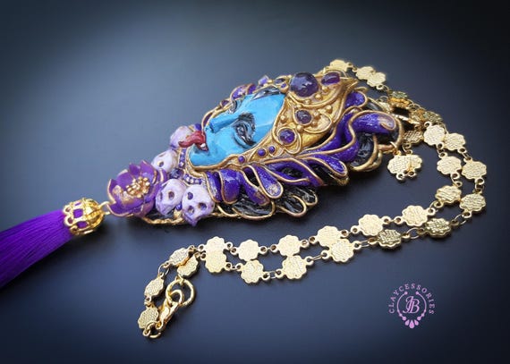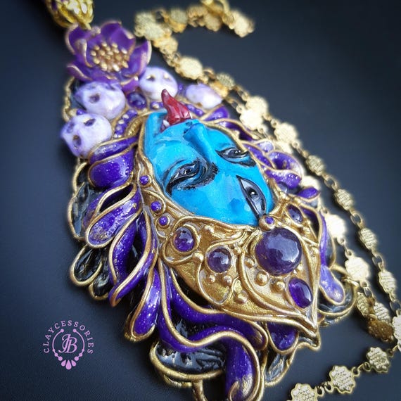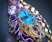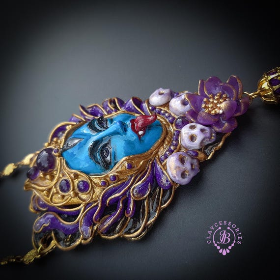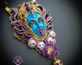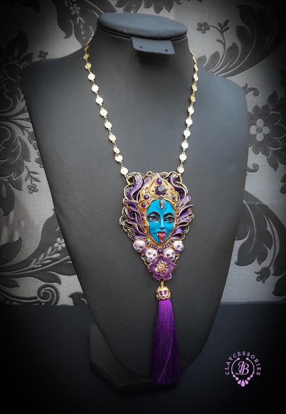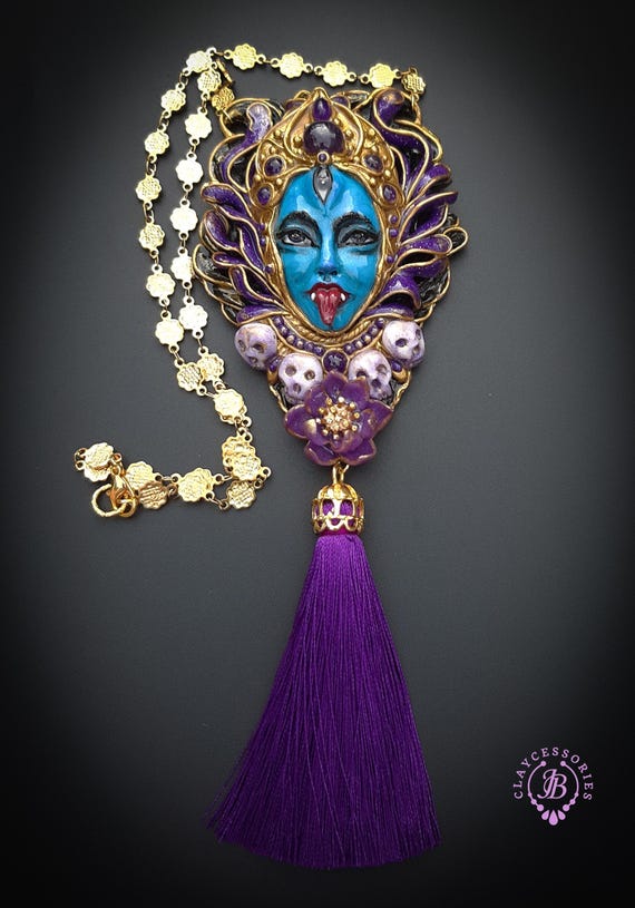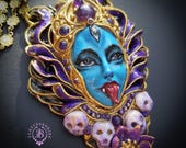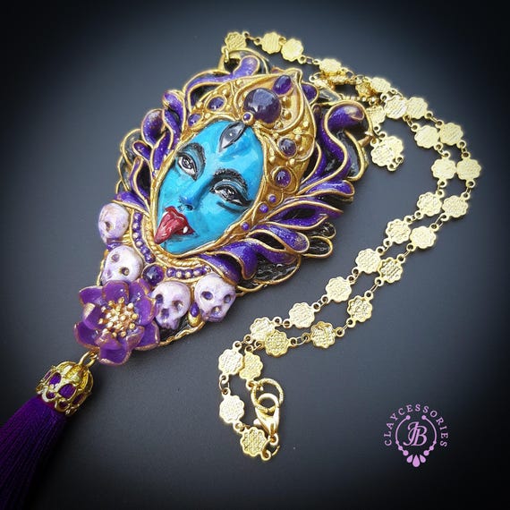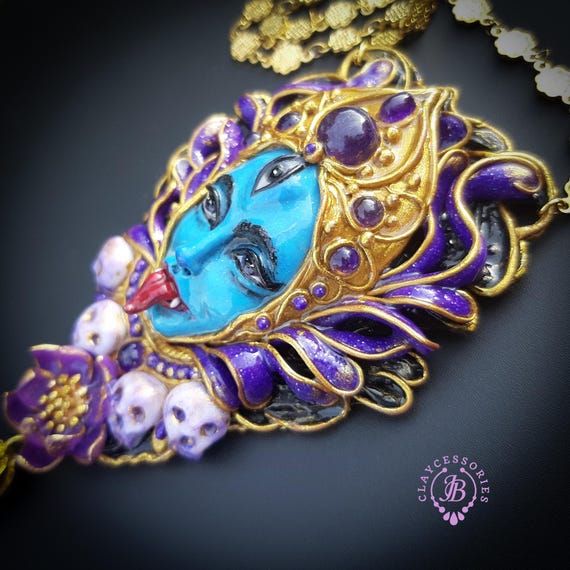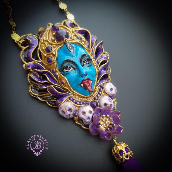 Kali Goddess of Renewal necklace, handmade by polymer clay, decorated by natural Amethyst cabochons. In Hindu mythology, Kali is a complex and powerful goddess often associated with renewal, transformation, and liberation Single copy,100% Handmade OOAK necklace All details sculpted and carved from high quality colourful polymer clay, colours do not wash out and do not fade in the sun. All items are shipped from my home within 1-3 business days after payment confirmation. Please, contact with me for any questions. I make some custom orders. If you would like some items to be custom made or created for you in a special way, feel free to send an Etsy conversation with your requirements, and we can discuss them.