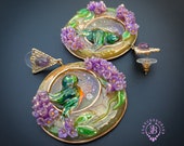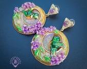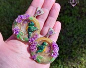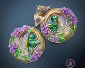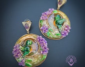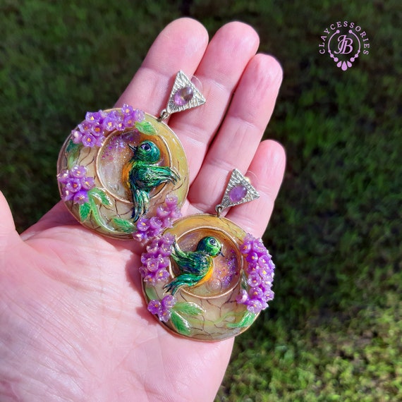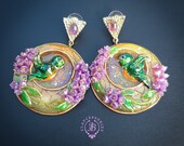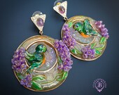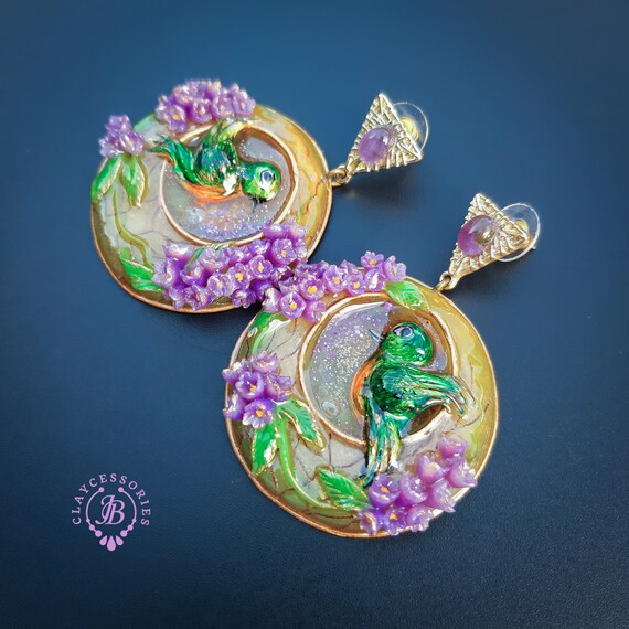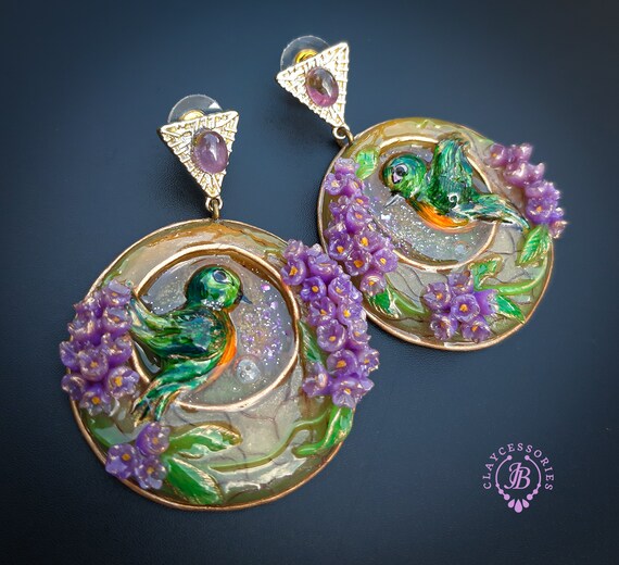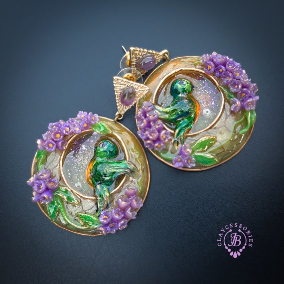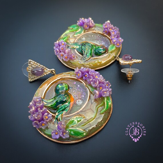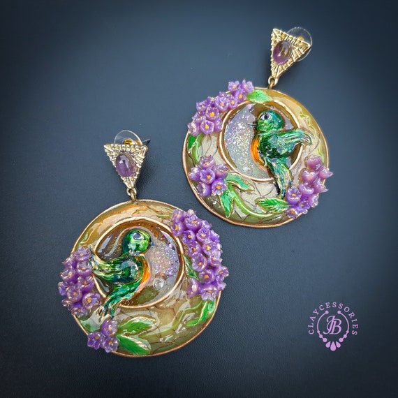 Spring Lilac flowers and Birds Art Nouveau earrings, translucent, very lightweight and delicate. All details sculpted and carved from high-quality colourful polymer clay, colours do not wash out and do not fade in the sun, decorated by natural Amethyst cabochons. Single copy,100% Handmade OOAK earrings. All items are shipped from my home within 1-3 business days after payment confirmation. Please, contact me with any questions. I make some custom orders. If you would like some items to be custom made or created for you in a special way, feel free to send an Etsy conversation with your requirements, and we can discuss them.