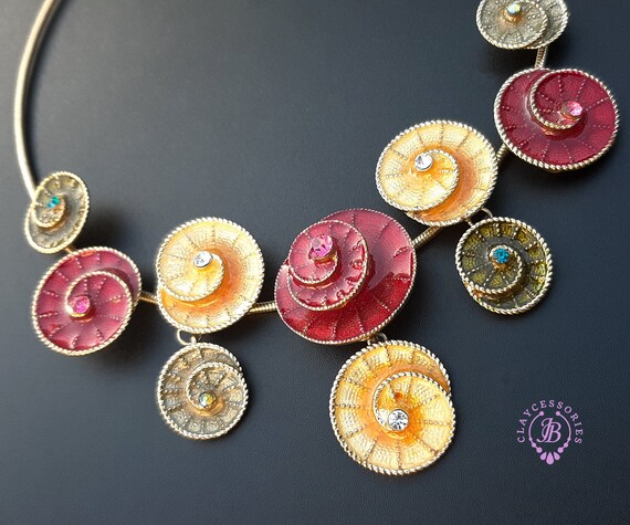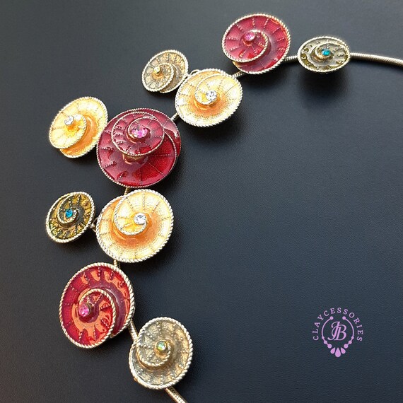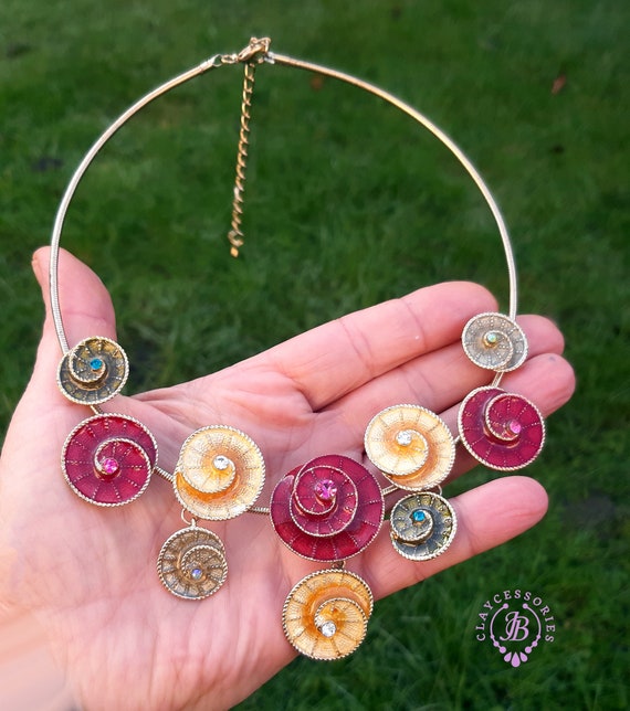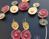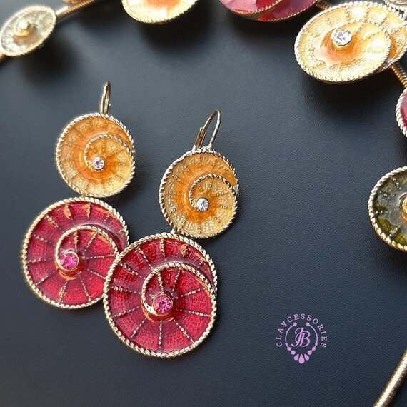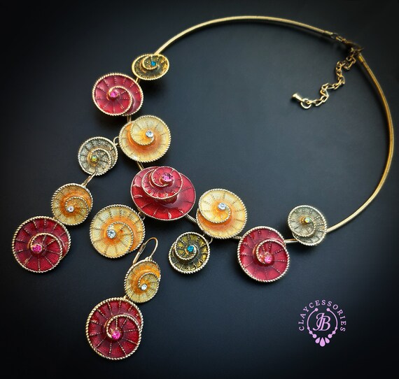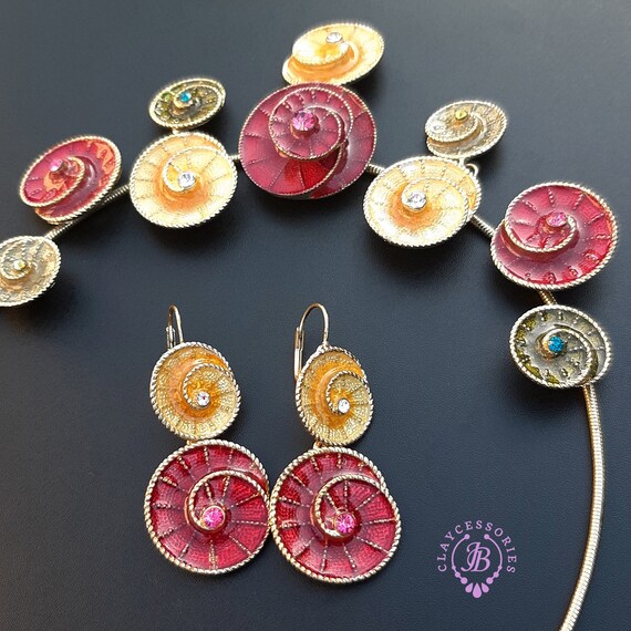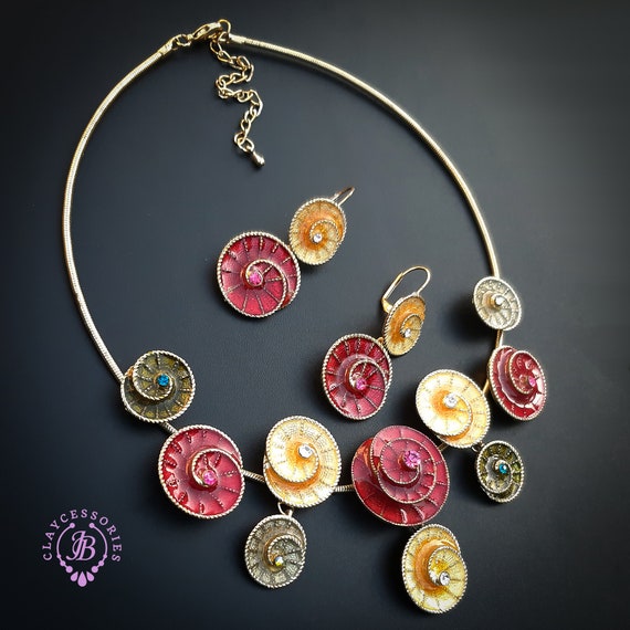 Colourful swirl necklace and earrings jewellery set, made of metal, covered with liquid polymer clay and enamel, decorated with Swarovski crystals. All items are shipped from my home within 1-3 business days after payment confirmation. Please, contact me with any questions. I make some custom orders. If you would like some items to be custom made or created for you in a special way, feel free to send an Etsy conversation with your requirements, and we can discuss them.